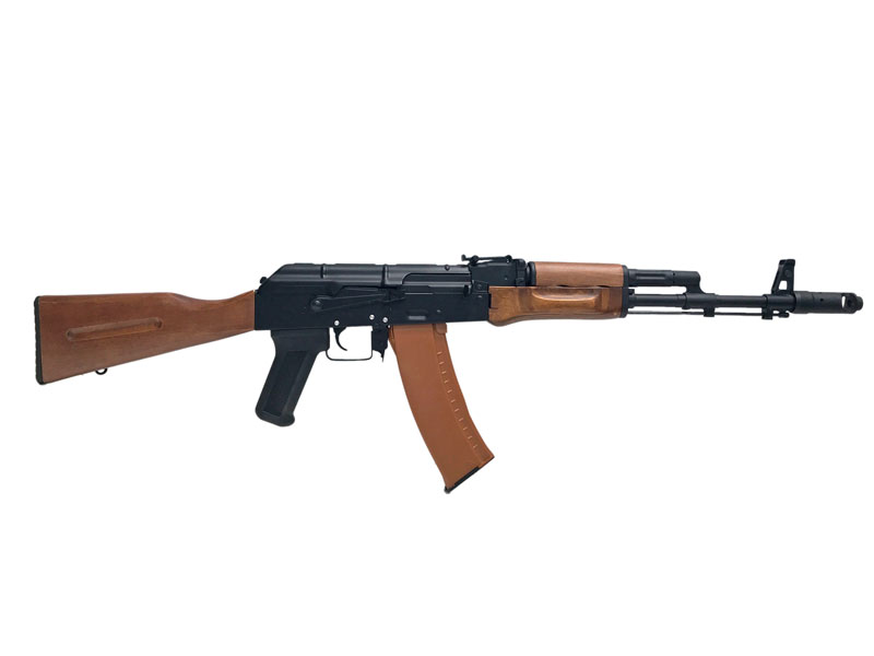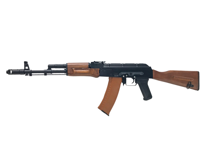 DOUBLE BELL AK-74 006A 珍しくも正統派スタイルを貫いたAK-74N電動ガンが登場。リアルウッドのストックやハンドガード、プレス製レシーバーなど、本格的な造形美が光る一丁です。大型マズルブレーキやベークライト調マガジンなど、細部まで忠実に再現。光学機器マウントを備えたAK-74Nを、こだわりの仕様でモデルアップしています。