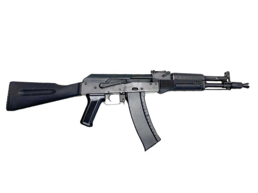 1959年にAK47の後継として配備が始まった突撃銃。AK47と構造はほぼ同一だが、プレス技術の向上により、レシーバー部を削り出しから、初期のAK47でも採用していたプレス製ボディに変更したため、生産効率の向上と軽量化に成功している。またレートリデューサーを装備している為、操作性はAK47よりも良くなっている。その他、ショルダーストックやフォアエンド、ガスポートの形状変更など、細かい変更点は意外に多い。バージョン違いとして1960年にフォールディングストックを装備したAKMSが、1975年に特殊部隊・空挺部隊向けにカービンモデルのAKMSUが開発された。AKMとは、「Avtomat Kalashnikova Modernizirovanniy;Автомат Калашникова Модернизированный(改良型カラシニコフ式突撃銃)」の略であり、マズル先端が斜めに切断されているように見えるのが最大の特徴である。これは発射ガスを上方に吹き上げて銃口の跳ね上がりを抑える、コンペンセイターの役目を果たす。なお小さな変更だが、このAKMから着剣装置が復活している。前作AK47には当初、着剣装置がなく、後にかなり苦労してスパイク状のバヨネット(銃剣)を追加した例が見られた。また、このAKM用のバヨネット(上の写真・右下に写っている物)は、サヤと組み合わせることでワイヤーカッターとして使うことができる。さらにグリップの部分が絶縁されているため、例えば通電された鉄条網などでも安全に切断することが可能。これがなかなかの優れもので、後にアメリカ軍でもほとんどそのままに取り入れられ、制式化された。