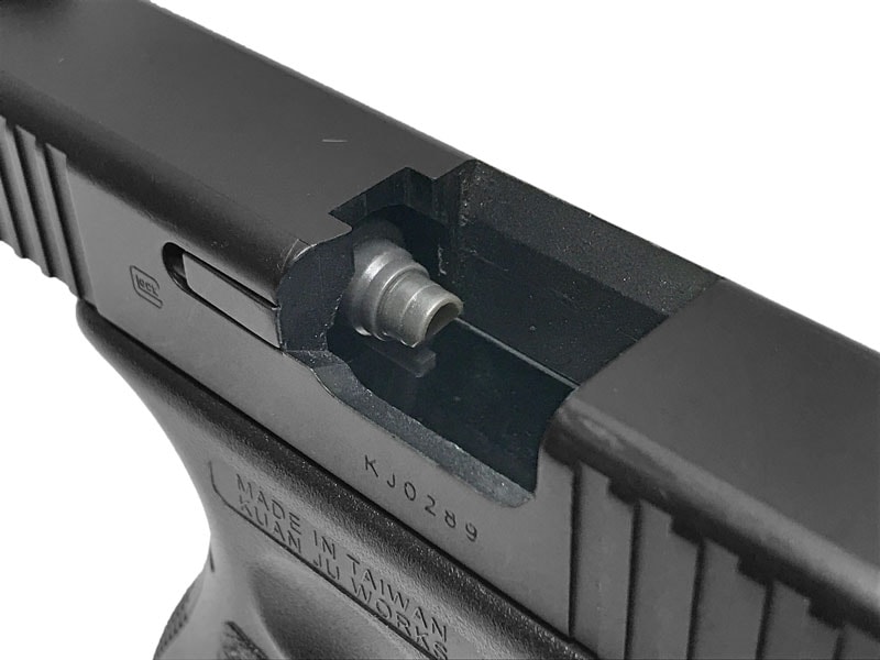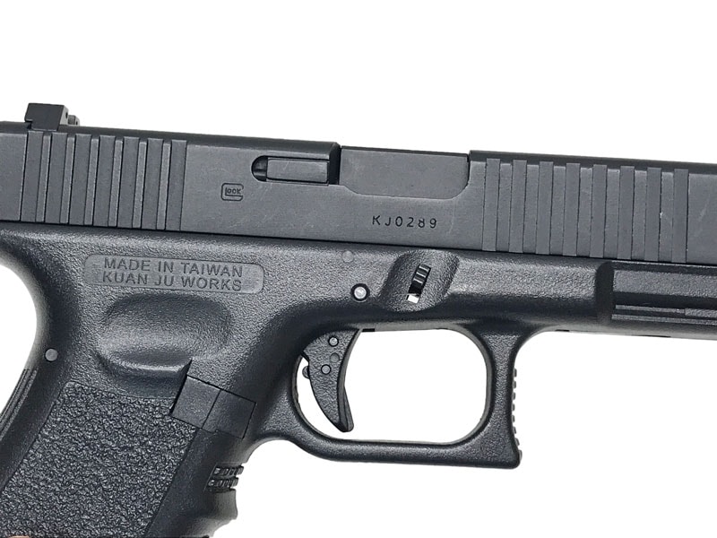 [KJ WORKS] グロック19 樹脂スライド リアル刻印Ver. ブリーチ切削/フロントセレーション追加加工 (中古)の販売ページ|エアガン.jp