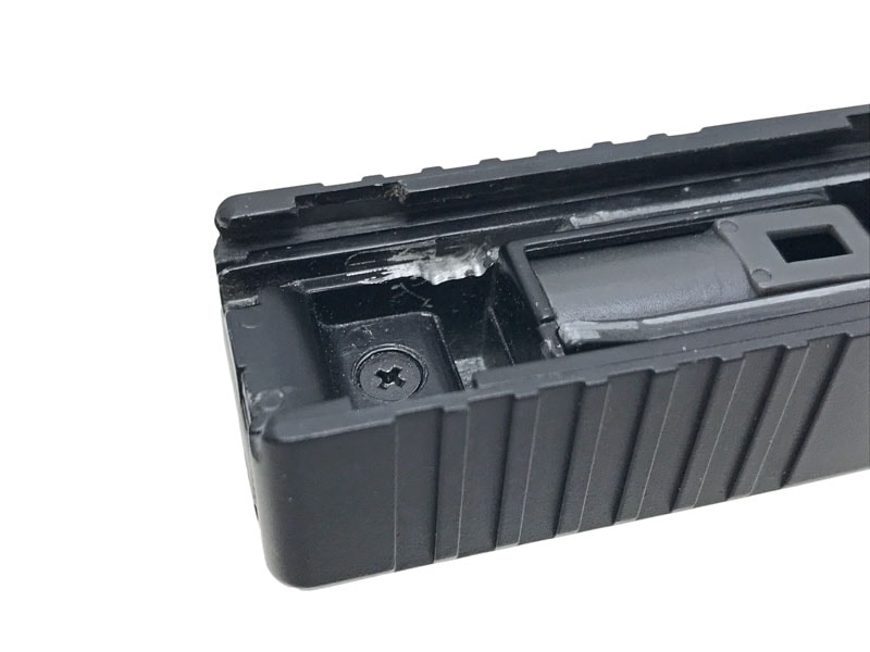 [KJ WORKS] グロック19 樹脂スライド リアル刻印Ver. ブリーチ切削/フロントセレーション追加加工 (中古) 製品詳細画像8 ブリーチ切削あり