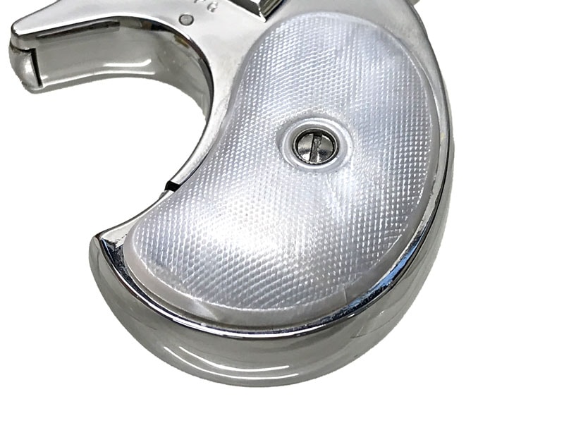 超小型ピストル・デリンジャー。中折れ式のガンでカートリッジを二発装填できる。小ぶり故に、映画など各メディアで知名度の高い銃。輝きの眩しいオールシルバーモデル。