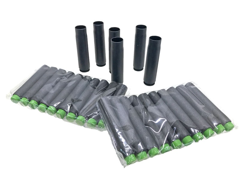 スポンジ製 ソフト弾をカートに入れてマガジンに装填し、本体に取付後コッキングハンドルを引いてトリガーを引くと発射されます。