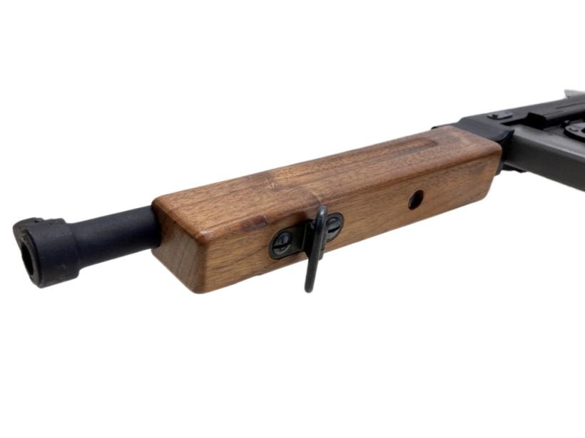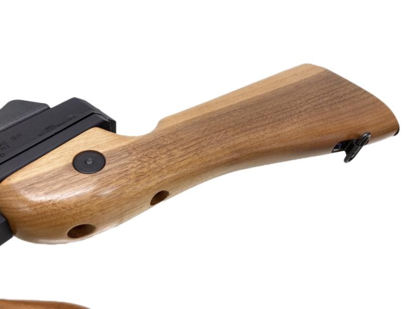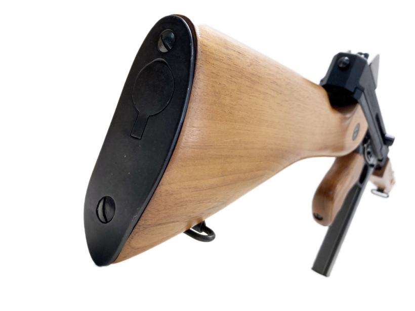 タナカ製トンプソン・サブマシンガン。CMCトンプソンと同じ金型から作られた金属モデルガンであり、その重量・迫力はお墨付き。木製部材の仕上げは流石のタナカで、非常に美しい。