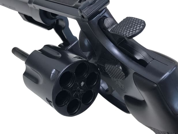 クラウンモデル製 S&W M19 エアコッキングガン。リアルなスイングアクションが可能。カートリッジにBB弾を装填し、シリンダーにカートリッジを装填し発射する。