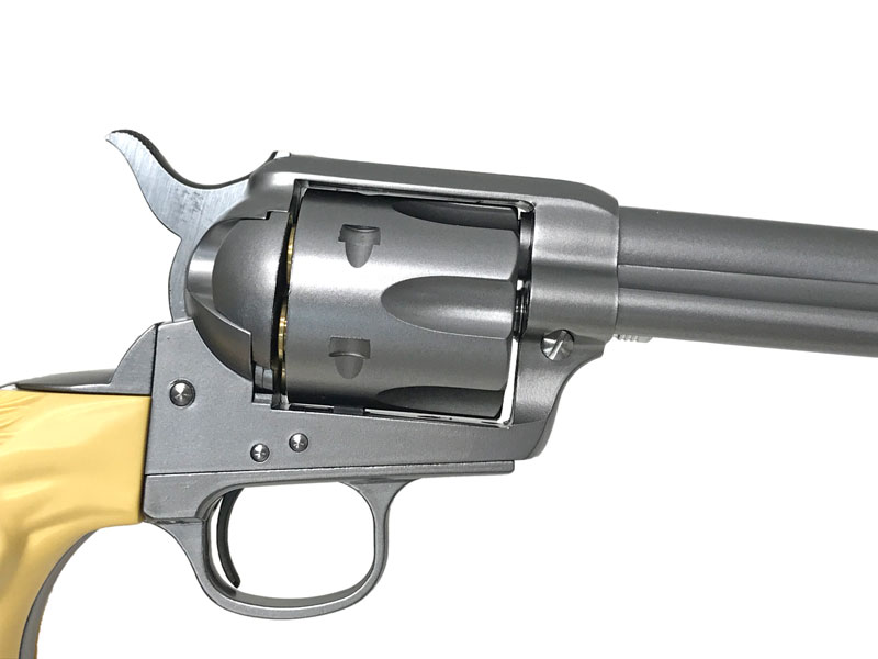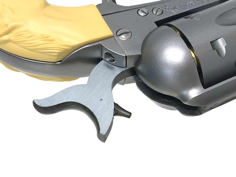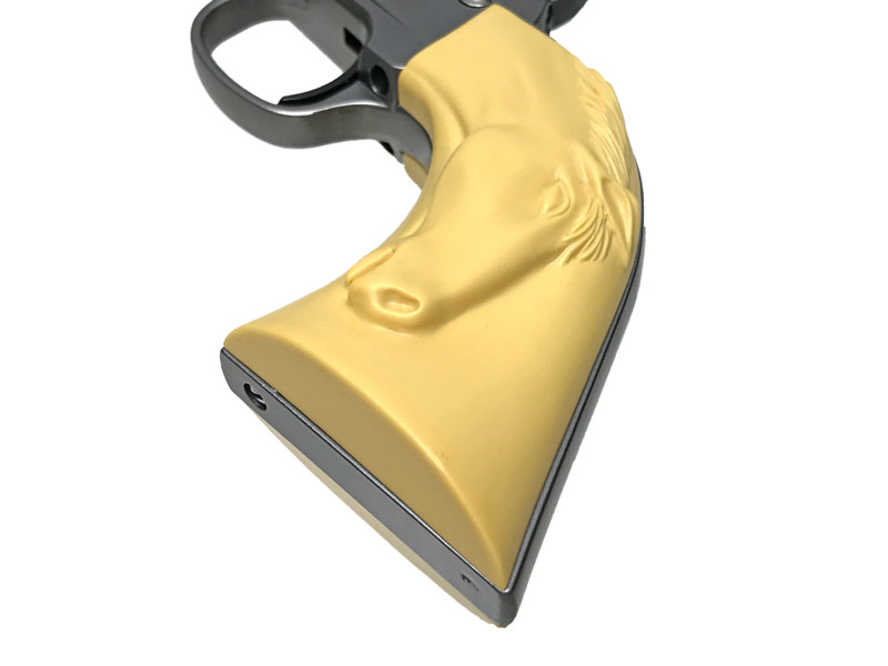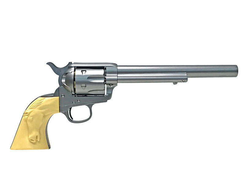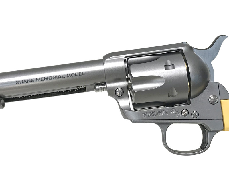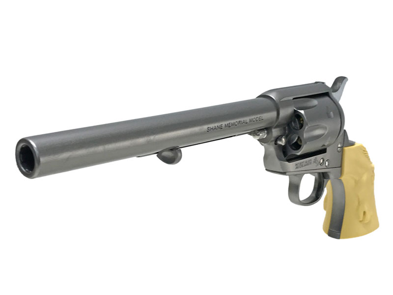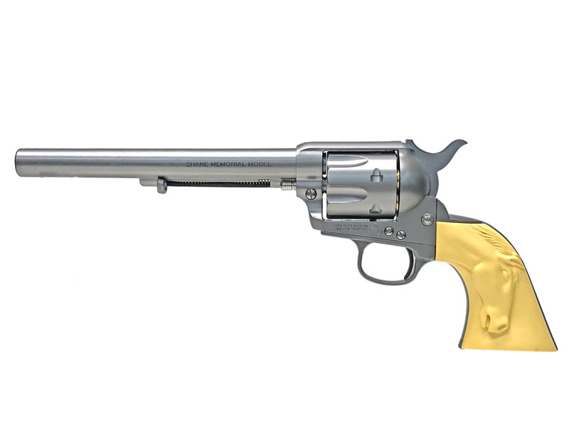 HWS SHANE MEMORIAL MODEL 西部劇の名作『シェーン』でアラン・ラッドが手にしたピースメーカーをモデルガンとして再現。SAAキャバルリーをベースに、フロントサイトレス仕様や左右のホースレリーフグリップ(ウェイト入り)といった劇中の特徴を忠実に表現しました。バレル・フレーム・シリンダーはクロームメッキ仕上げ、グリップはホワイト寄りのナチュラルベージュカラーで再現されています。