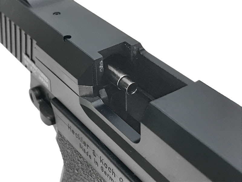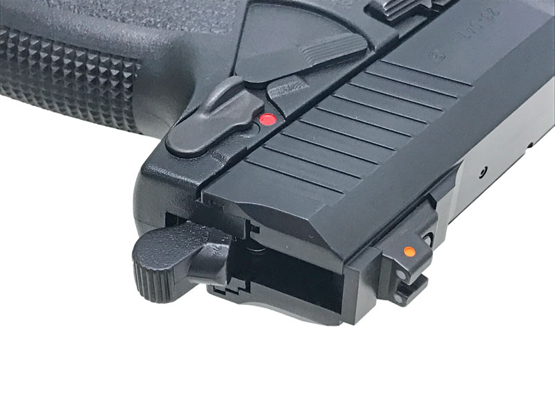 リアサイトとフロントサイト左側面にあるオレンジ色の円形の窪みや、フレームの左側面と前方下部に打刻されている刻印など細部を忠実に再現。