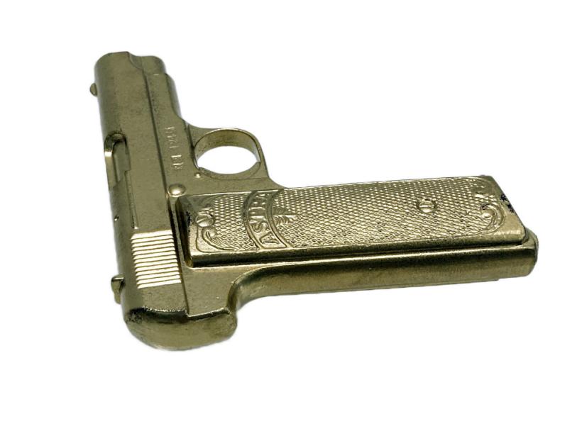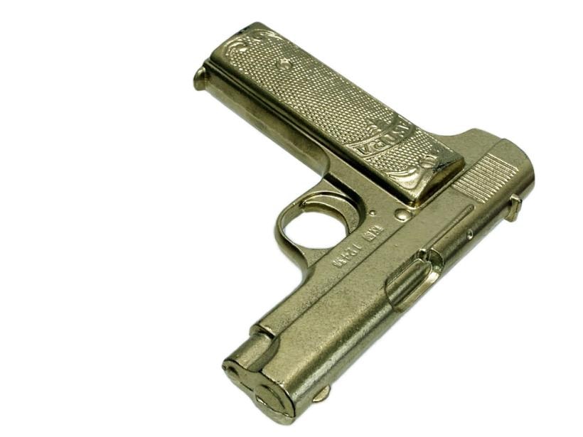 可動部分が一切ないためにエアガン、モデルガンよりはるかに安全ですが、外観のリアルさゆえ、取扱には十分注意してください。文鎮は机上アクセサリー、美術工芸品として制作されております。