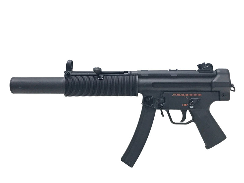 世界最高のサブマシンガンとして認められているMP5シリーズにおいて、特殊作戦を実行する際に使用される消音効果のあるサプレッサーを装備したモデル。サプレッサーのできはすばらしく、チャンバー付近からバレルを覆うように作られており、後からつけたサプレッサーとは比べ物にならない実力を持つ。各国の軍・警察の特殊部隊に制式採用されているが、日本のSATにも少数ではあるが採用されている。 H&K社が、1974年頃に開発した特殊作戦用短機関銃。同社のMP5に、銃身と一体化したサウンドサプレッサーを設けている。SDとはSchalldämpfer(シャルデンプファー。独語で"消音装置")の略。 大型の減音器で発砲音を減少させると共に、内蔵の銃身部に設けた幾つものベント穴で腔圧を落とし、本来超音速で飛ぶ9mmx19弾を亜音速弾として発射することができる。異様な見た目とは裏腹に、発射音やマズルフラッシュの軽減効果はかなりのもの。15メートル離れると、ボルトの前後音しか聞こえないという。 世界各国の軍・警察の特殊部隊に制式採用され、アジアでは韓国のKP-SWAT(韓国国家警察・特攻隊)や海洋警察特殊部隊、マレーシア空軍特殊部隊などが正式配備しており、陸上自衛隊の特殊作戦群(SFGp)や海上自衛隊の特別警備隊(SBU)でも配備されていると推測される