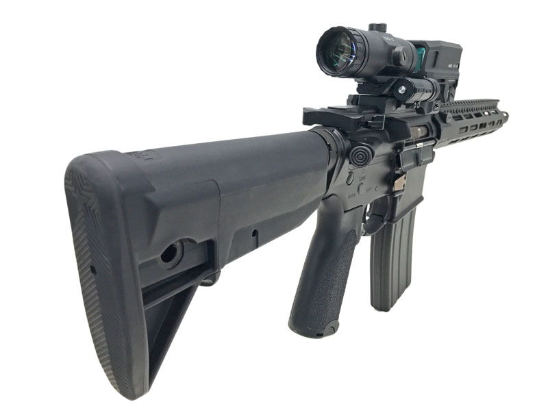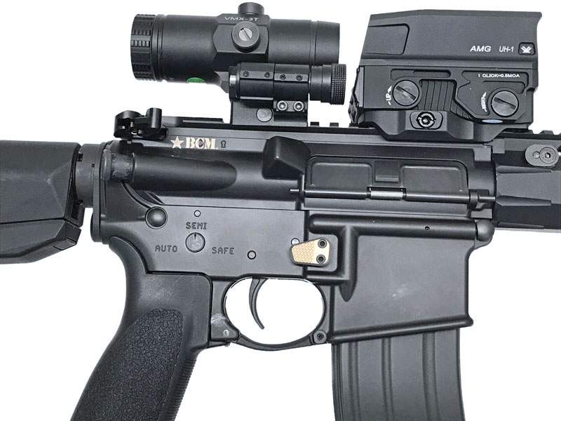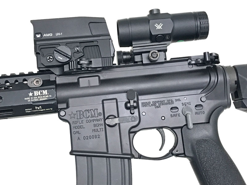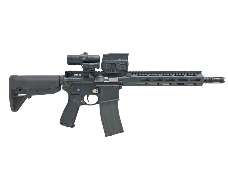 MWS BCM MCMR CQB 11.5 GunsModifiy製 BCM刻印レシーバーをはじめとして、ハンドガード、ストック、フォアグリップ、ボルト、ガスブロックまでBCM刻印の物に交換されたコンプリートライフル。Z-systemベースなので動作性抜群。もちろん、マルイマガジンに対応している。レプリカではあるが、Vortexタイプ AMG UH-1とVMX 3Tタイプダットサイト マグニファイアーコンボを搭載!