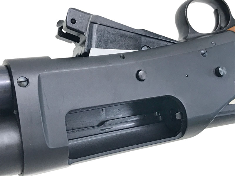 そのためレシーバーの全長が若干短く、排莢孔のカバーを設けるスペースもないため、中のメカがのぞけるようになっている。