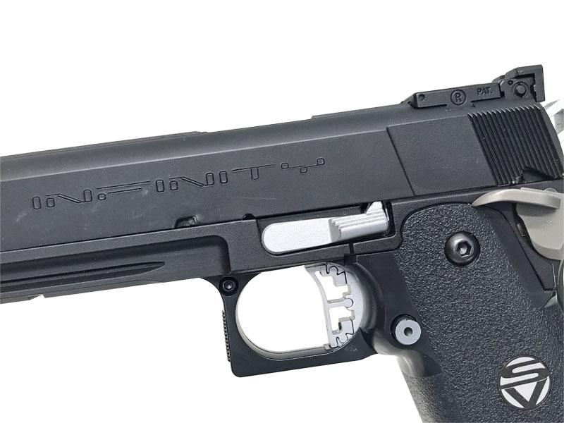 Strayer-Voigt Infinity 6.0 EXP SVI エキスパートピストルは、スライド形状が個性的なスリーサイデッドタイプ。普段見慣れた.45オートとは違う、近代的な魅力にあふれたSVI社最新のスタイル。