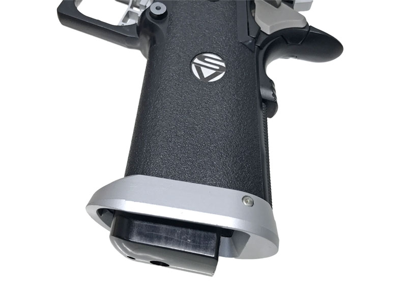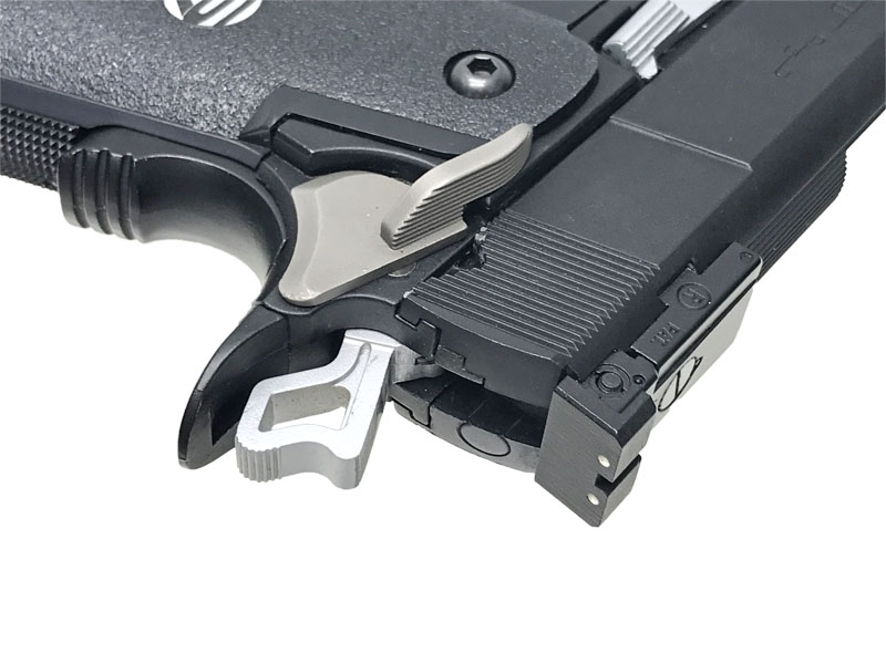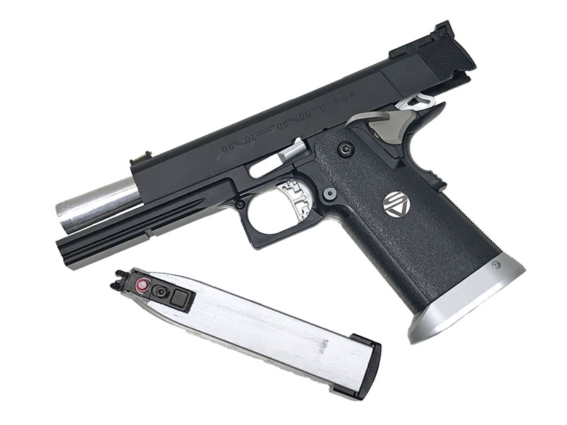 ハンドガンの場合は全体を金属性とする組み換え、エアソフトガンの場合は射出エネルギー0.98J以上にする改造を行うと銃刀法違反となります。HFC134a仕様のガスガンにCO2用マガジンを組み込む、スライドを金属製の物に差し替える等、簡易な改造でも罪に問われる可能性がございますので、絶対にお止めください。