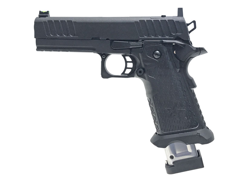 『BS-STACCATO 4.3』は連邦保安局(USMS)のSOG(特殊作戦グループ)に制式採用されたSTI/STACCATO製2011系ハイキャパシティオート『Staccato-P-DUO』をモチーフとしており、いわゆるコマンダーレングスに近い4.25インチバレルとフルサイズダストカバー仕様のフレーム、ブリーチ上部に小型ドットサイトをダイレクトにマウント可能なオプティクスレディ仕様のスライドといったフィーチャーが特徴。実銃はUSMS SOGの前制式拳銃であったSFA製M1911・プロフェッショナル45とは異なり、口径は9mmx19が選択されており、シングルスタック/45口径の1911系には不可能な21+1発というハイキャパシティを実現。