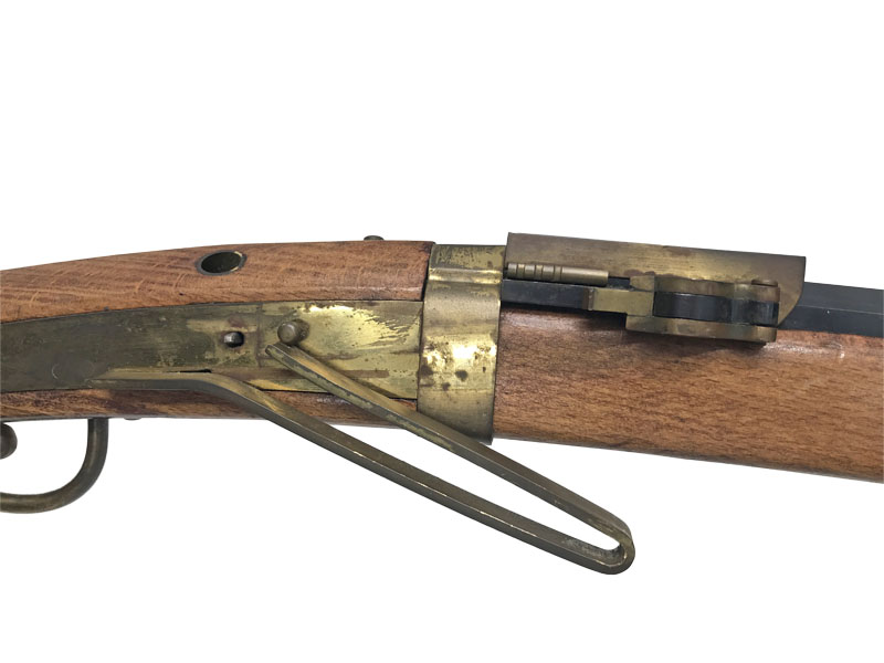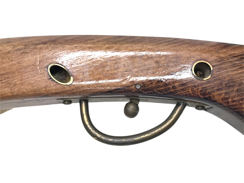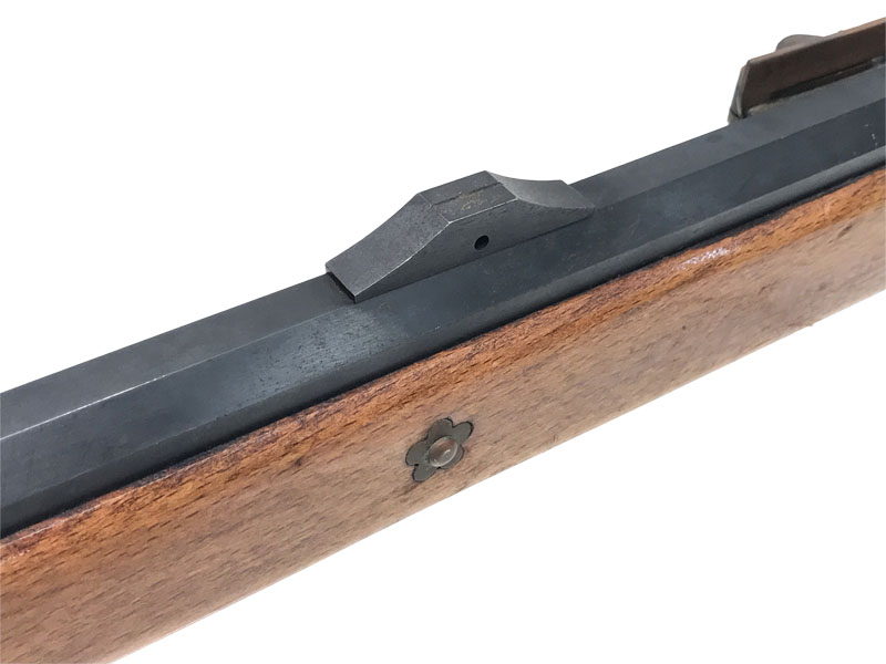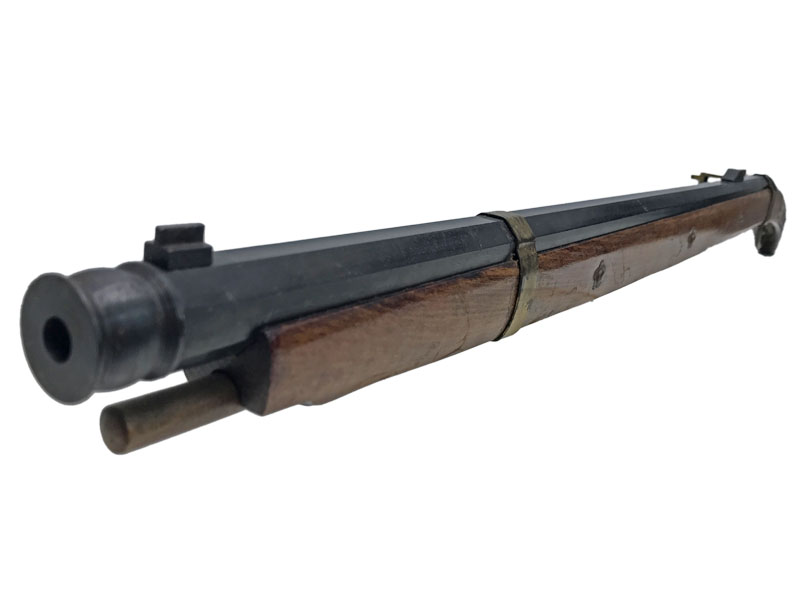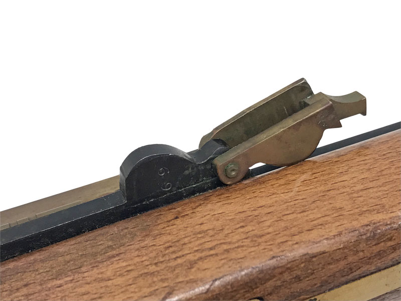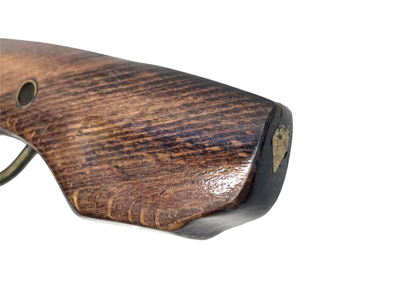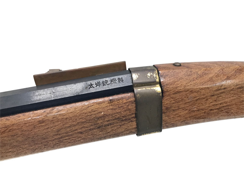 実銃メーカー大洋銃機が昭和49〜52年に製作した火縄銃レプリカ。発射機構は無く銃身は閉塞。鉄製削り出し風の精巧な造形と「大洋銃機製」の刻印が目を引く。銃床はウレタン仕上げでもちろん実射不可。模造品扱いで銃砲法対象外でも遠目には本物にしか見えない説得力を持つ一挺だ。細部には省略も見られるが、持った時の重量感と存在感は実銃に迫る。
