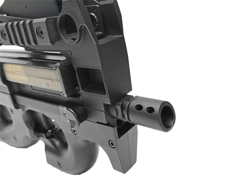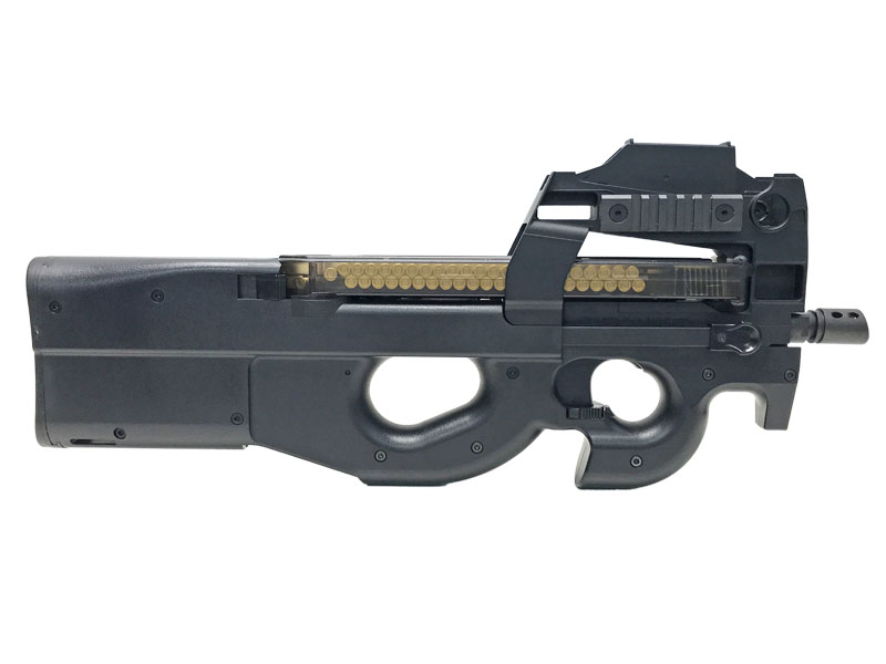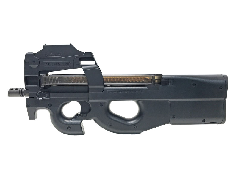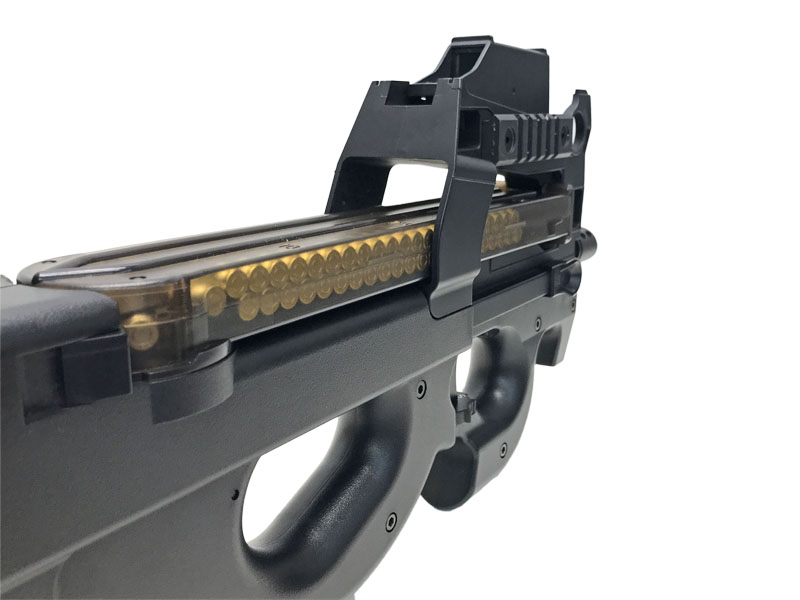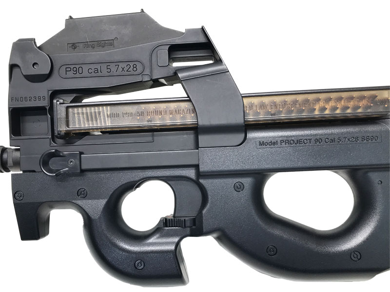 P90は幾つもの画期的な特徴を備えている。銃本体はプラスチックを多用したブルパップ形状だが、銃下面に排莢口を設けることで射手の利き手を選ばず、左右臨機応変に構えなおすことを可能にしている。また、マガジンは50発というハイキャパシティながら、レシーバー上部に銃身と平行に配することで、本体から大きく張り出すことなくコンパクトにまとめられている。弾丸は横向きに複列装弾されているが、バネによって90度回転させることで本体薬室に送弾する。
