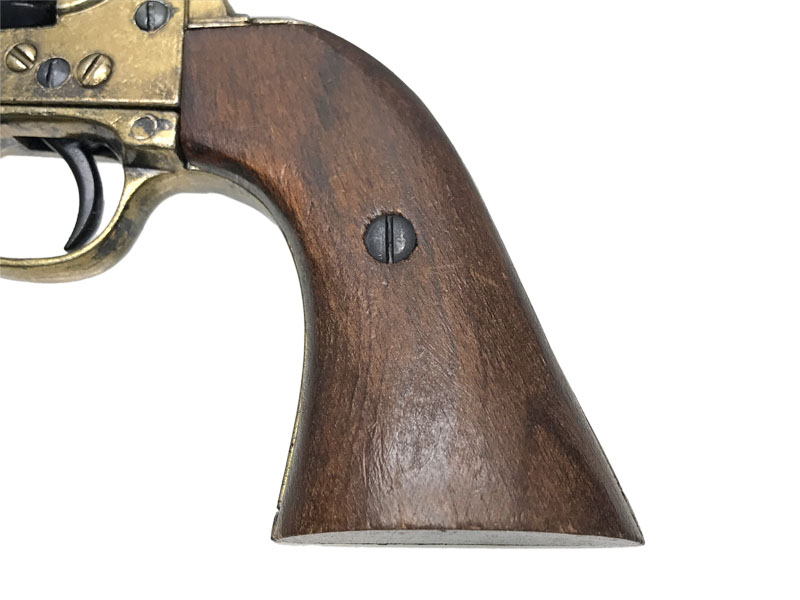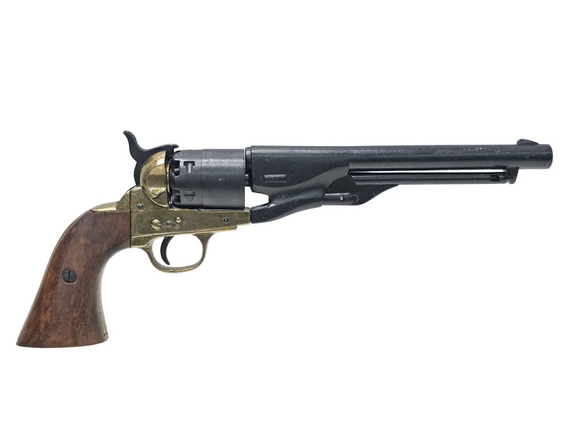 コルト1860アーミーリボルバーのレプリカ。金属フレームに木製グリップ、可動するシリンダーと装填機構を備えた観賞用モデル。