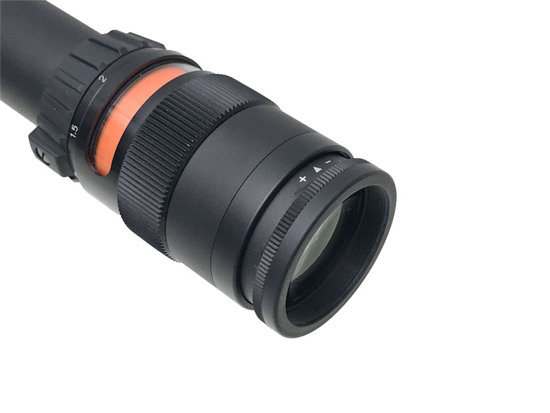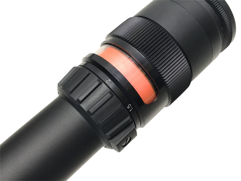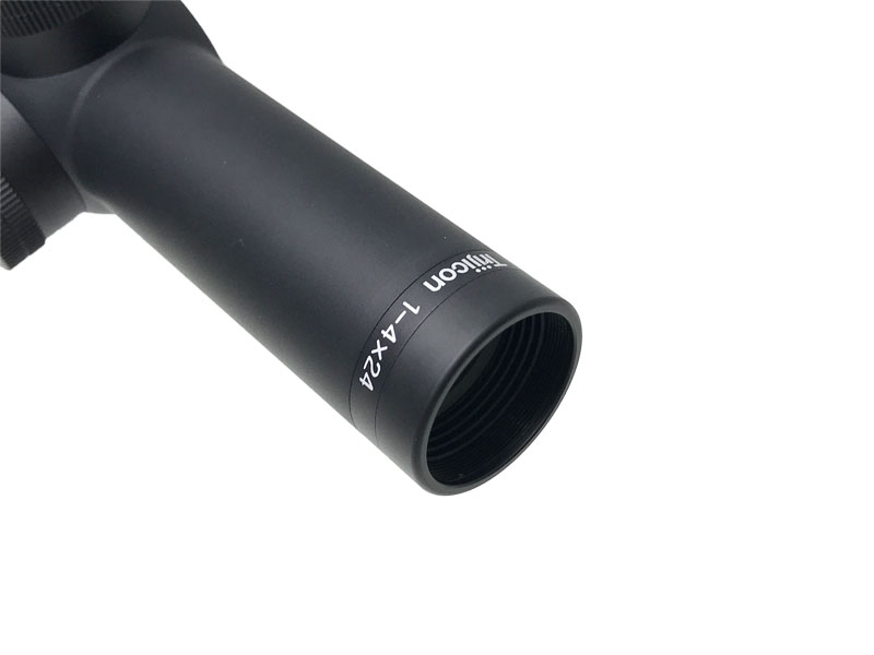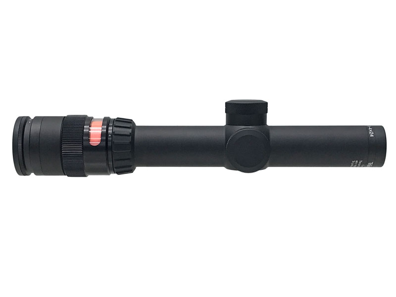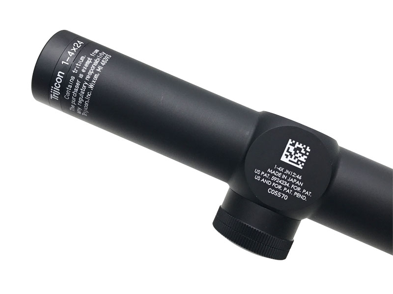 Trijicon TR24 Trijicon製の実物スコープは、1〜4倍可変の集光式モデル。接眼部の集光窓で光を取り込み、レティクルをレッドで発光させるためバッテリー不要。昼間でも非常に明るく、輝度調整ダイヤルで視認性を自在にコントロールできる。6061-T6アルミ製の堅牢な30mmチューブに収まり、防水性能は3m。全長280mm・重量約545gと扱いやすく、Trijiconらしい高い信頼性を備えたスコープだ。