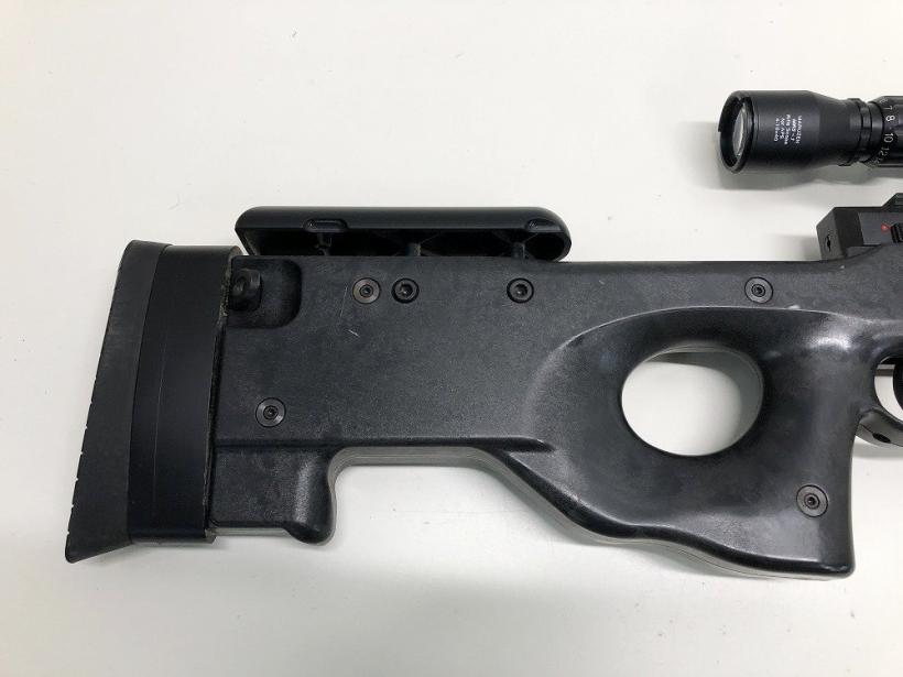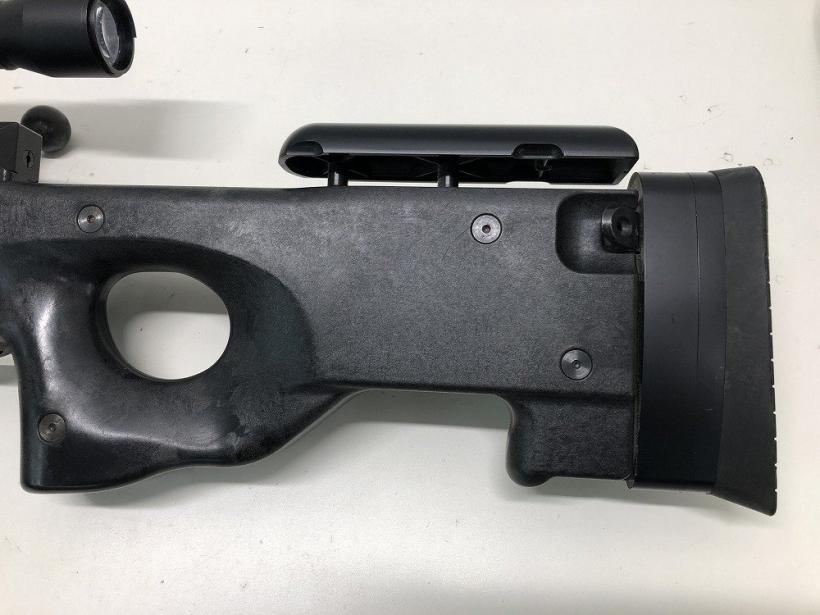 付属スコープの接眼レンズ側の縁に欠けが見られます。マガジンの固定が甘い為訳あり品としています。(下からマガジンを押してやれば発射は可能)また初速が56m/s前後と遅めになります。