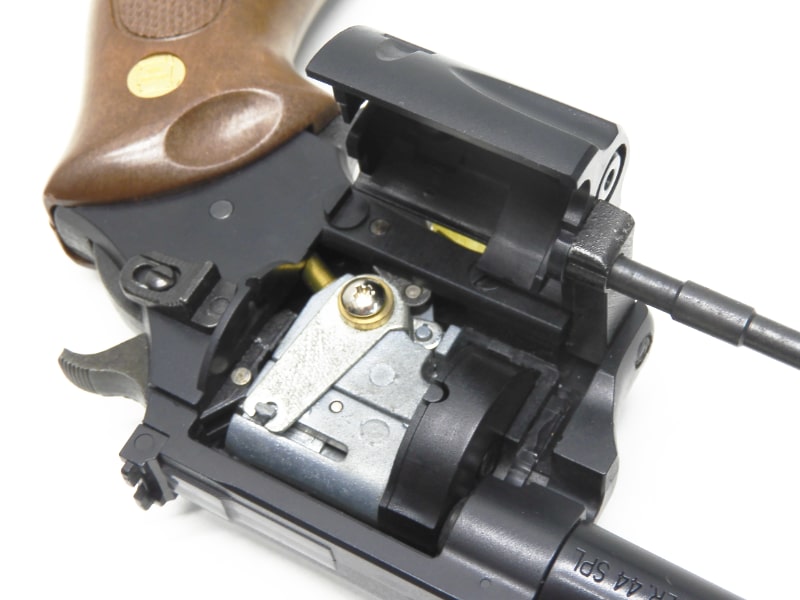シリンダーに見える部分は実はダミーで、左側半分をスイングアウトすると内部ユニットが見え、そこへカセットマガジンを装着します。