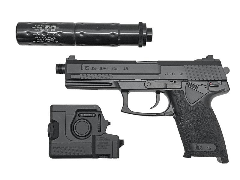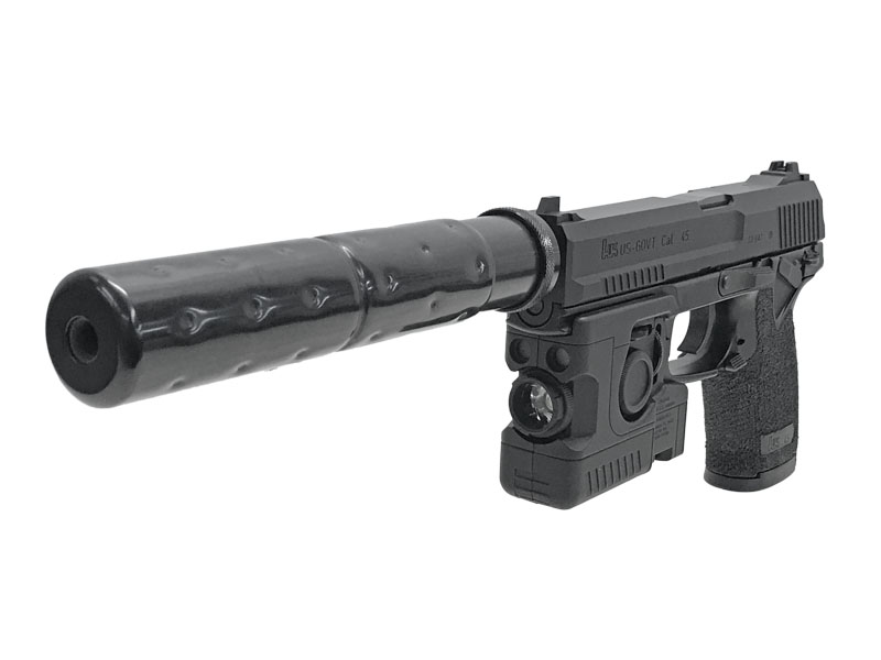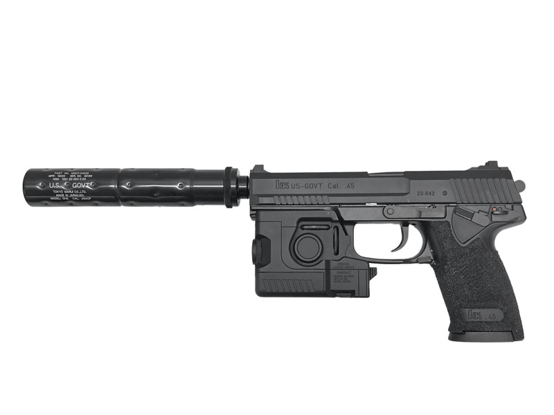 東京マルイ製SOCOMをベースに考えうる限りの作動音を徹底的に排除しフィクスドハンドガンの長所を最大限に活用したモデル。各作動部の研磨加工により、静音化のみならずトリガープルが驚く程スムーズになり、素早い連射にも対応。サイレンサー内部にはLAYLAX製ノイズリミッターを装備した、最強のサイレンサーモデル。マガジンバルブには絶版のライラクス製東京マルイソーコム用ハイバレットバルブが装着済み。