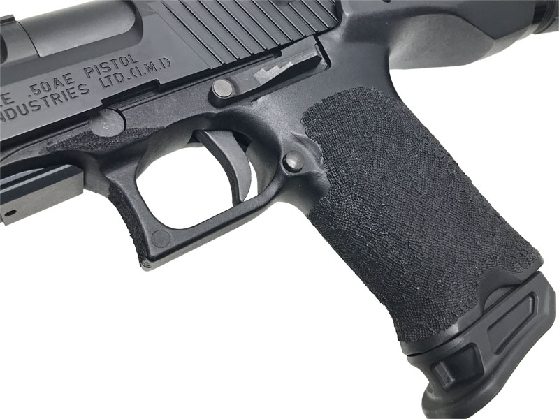 大型弾薬を使用するために前後に拡張されたグリップ、バレル上部に設けられた光学機器用レールなど、他のハンドガンとは一線を画す特徴的なデザイン。
