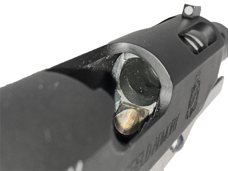 MGC 【SFA V10 Ultra Compact】 スライド先端のラウンド加工された穴からのぞくアウターバレルの10個の穴が特徴的。スプリングフィールド・アーモリー社が開発したコルトガバメント ベースのコンパクトモデルでありその刻印も再現されている。