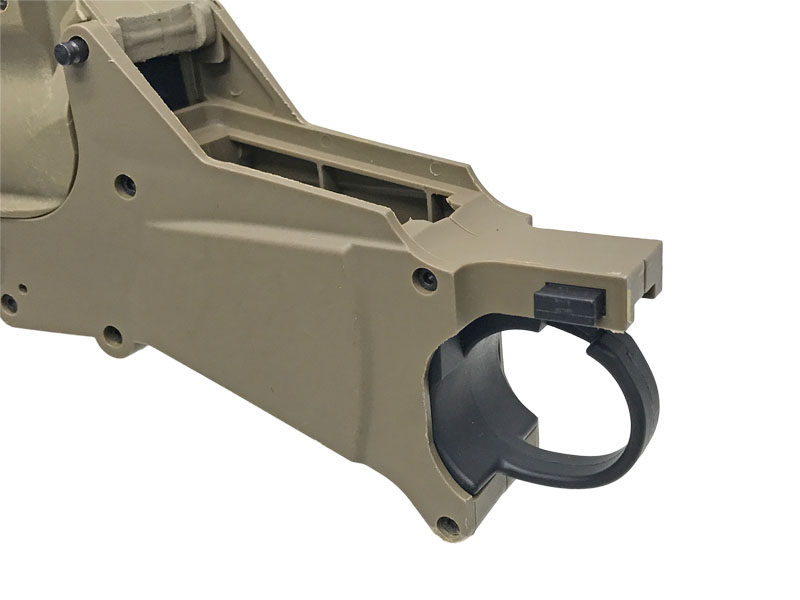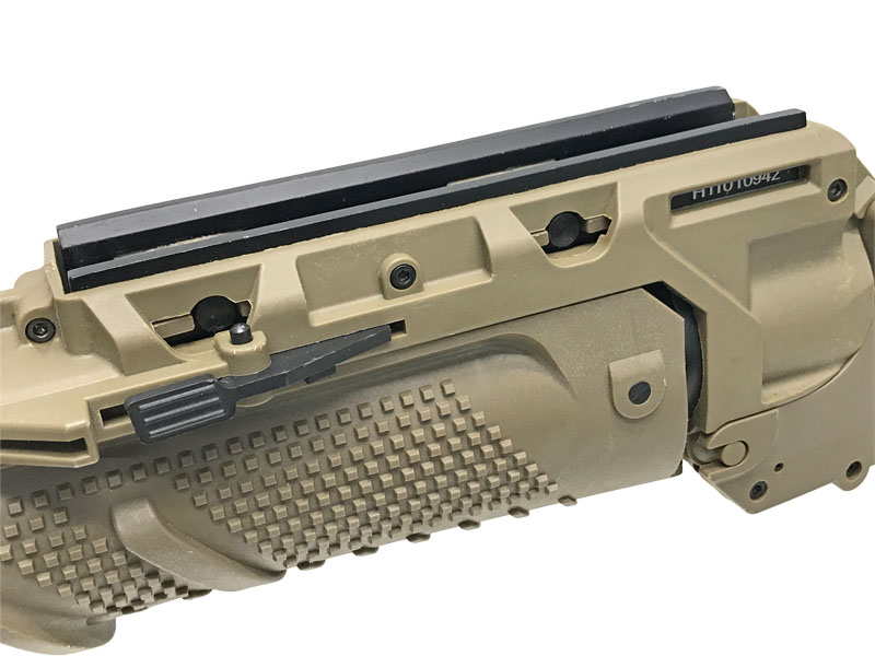 5.56mm(SCAR-L)のSCARに対応できるマウントトリガーパーツを装備。実銃同様の排薬ギミックを再現。トリガー上部にセーフティ装置があります。40mmガス注入式モスカート仕様。