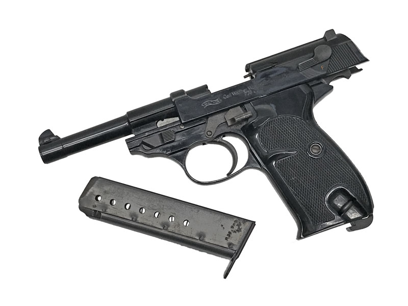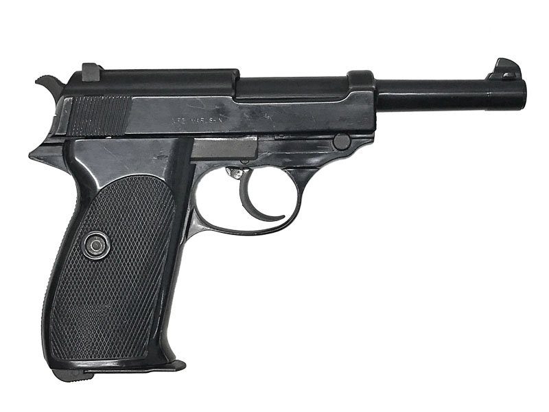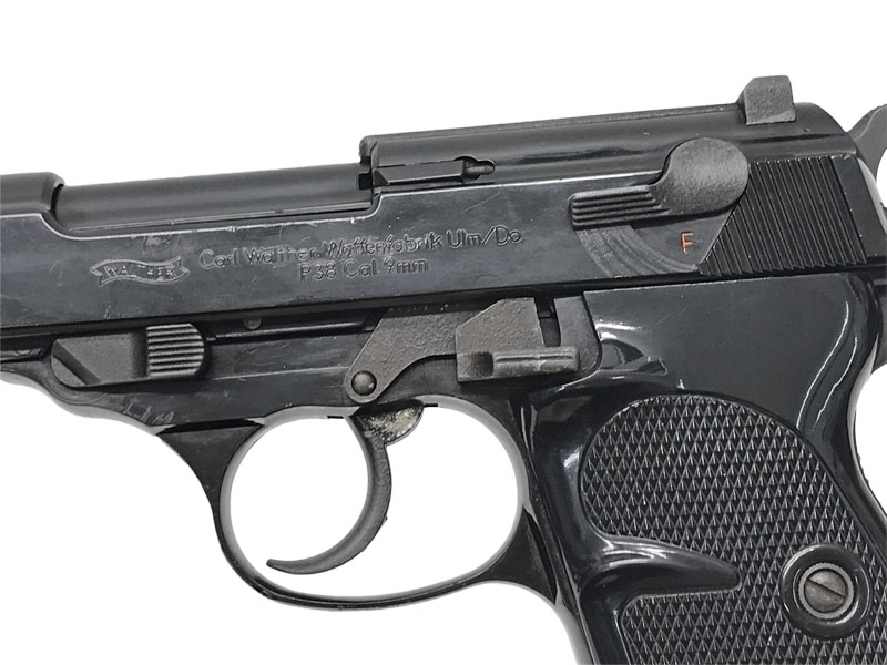 1938年にドイツ陸軍が制式採用した自動拳銃。1971年から放映された人気アニメ『ルパン三世』の主人公ルパン三世の愛銃として登場し、テーマソングでもその名が歌われた「ワルサーP38」は、日本で最も一般に知られている拳銃であろう。第二次大戦直前、それまでドイツ陸軍はルガー P08を制式拳銃として使用していたが、作りが精巧なため生産コストが高く、戦場の様な過酷な環境で使うには耐久性に難があった。そこで来るべき大戦に備えるべく、ワルサー社に安価で耐久性に優れた新型拳銃の開発を依頼。そして完成したHP(Heeres Pistolen)を、P38として制式採用した。最大の特徴はPPから継承したダブルアクション機構で、大型軍用オートマチックとしては世界初の試みだった。加えてデコッキング機構を組み込んだマニュアルセフティやAFPBなどを組み込み、安全性と即応性を飛躍的に高めている。  作動方式はAPから受け継いだショートリコイル&プロップアップ。銃身とスライドはコルト ガバメントなどのティルトバレル式(ブラウニング式)ではなく、独立したロッキングラグを用いる。この方式は銃身が水平に後退するのでぶれが少ないだけでなく、スライド内部にロッキングラグを削り込む必要がないため、生産性にも優れている。一方で、銃身は剥き出しでスライドは半分しかなく重心が後方にある為、他の拳銃に比べて銃口の跳ね上がりが大きいとされる。ただし、軍用銃としては水準以上の命中精度だったようだ。また一般的なオートマチックと異なり左側に排莢されるが、一説には自動車(左ハンドル)を運転しながら左手を窓から出して撃てるようにするためと言われている。  ダブルアクション機構などのために部品点数はやや多めだが、基本的なメンテナンスの際は、大きな部品3つ(スライド、フレーム、バレル)に分かれるだけで小さな部品が脱落する心配がない、と整備性も十分考慮されている。