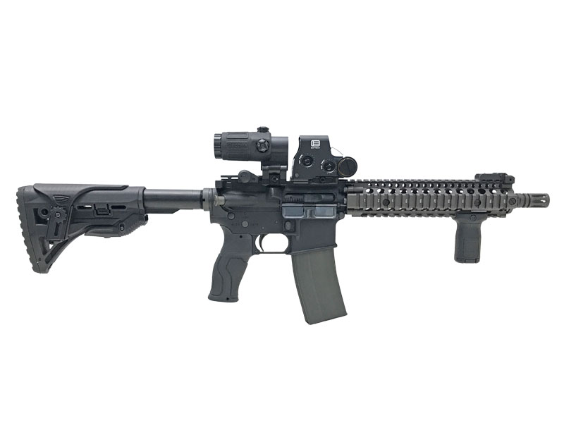 カスタム品 ショートフォアグリップ、FAB Defence製 グリップ、ストックを装備したカスタム品。さらに、ホロサイト、ブースターも装備。 GHK Mk-18 ダニエルディフェンス正規ライセンスにより、MK18 MOD1をリアルに再現したGHKの意欲作。T6061鍛造アルミをCNCで削り出し、ハードアルマイトで仕上げたレシーバーには、Colt×Daniel Defense両社の刻印が刻まれる本格仕様だ。内部にはGHK最新のM4 Ver.2 GBBシステムを搭載し、主要パーツにスチールを多用することで剛性と作動性を両立。2022モデルから採用されたクイックアジャストHOPチャンバーで調整も迅速。さらにCO2仕様の12gボンベをマガジン内にスマートに内蔵し、外気温に左右されない安定したブローバックを実現。リアリティと実射性能を追求した、GHK渾身のMK18だ。
