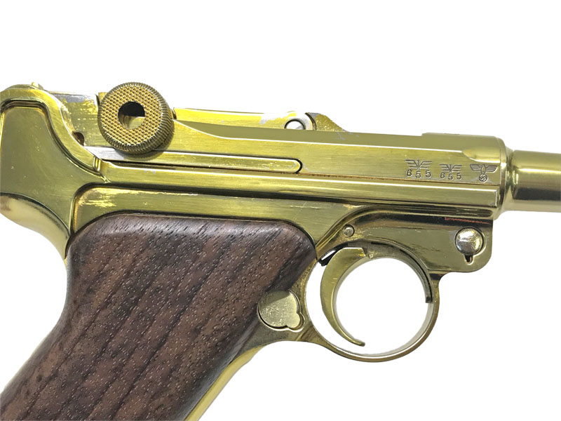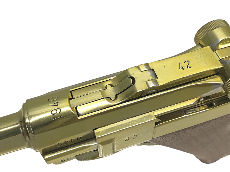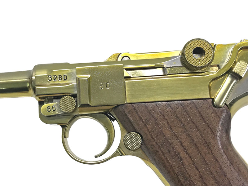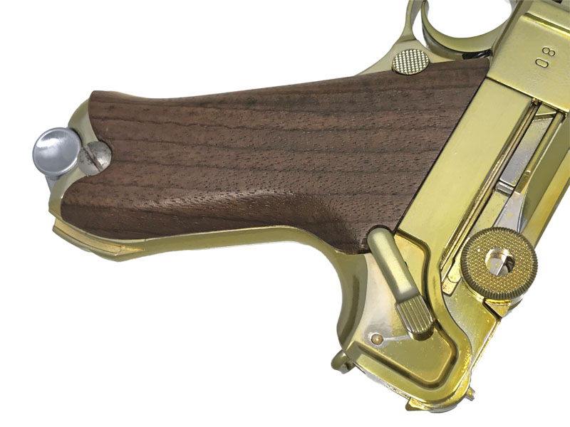マルシン LUGER P08 4インチ “Coded 42” モーゼル社製を示す「42」刻印を備え、独特のトグルアクションを再現した存在感のあるモデルだ。木製グリップと22金メッキ仕様により、850gという重量以上の重厚さを手に感じられる。トグルが跳ね上がる特有の作動は、P08ならではの魅力であり初見では驚くほど。実銃は1893年の原型完成からドイツ軍制式採用へと発展し、戦史を象徴する名拳銃として長く生産された一挺である。