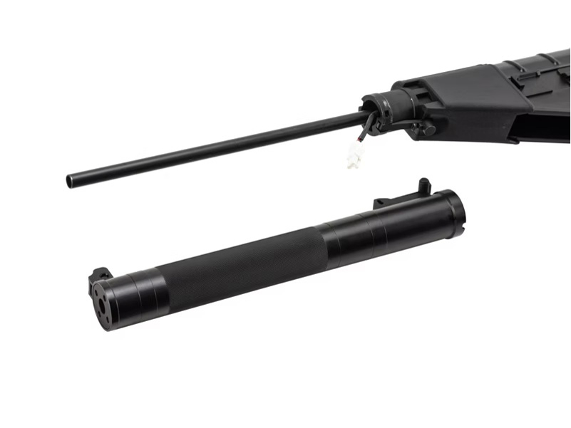 消音効果の高い大型のサプレッサーをレシーバー先端から銃口前方まで、銃身全体を覆うように装備しているのが最大の特徴。