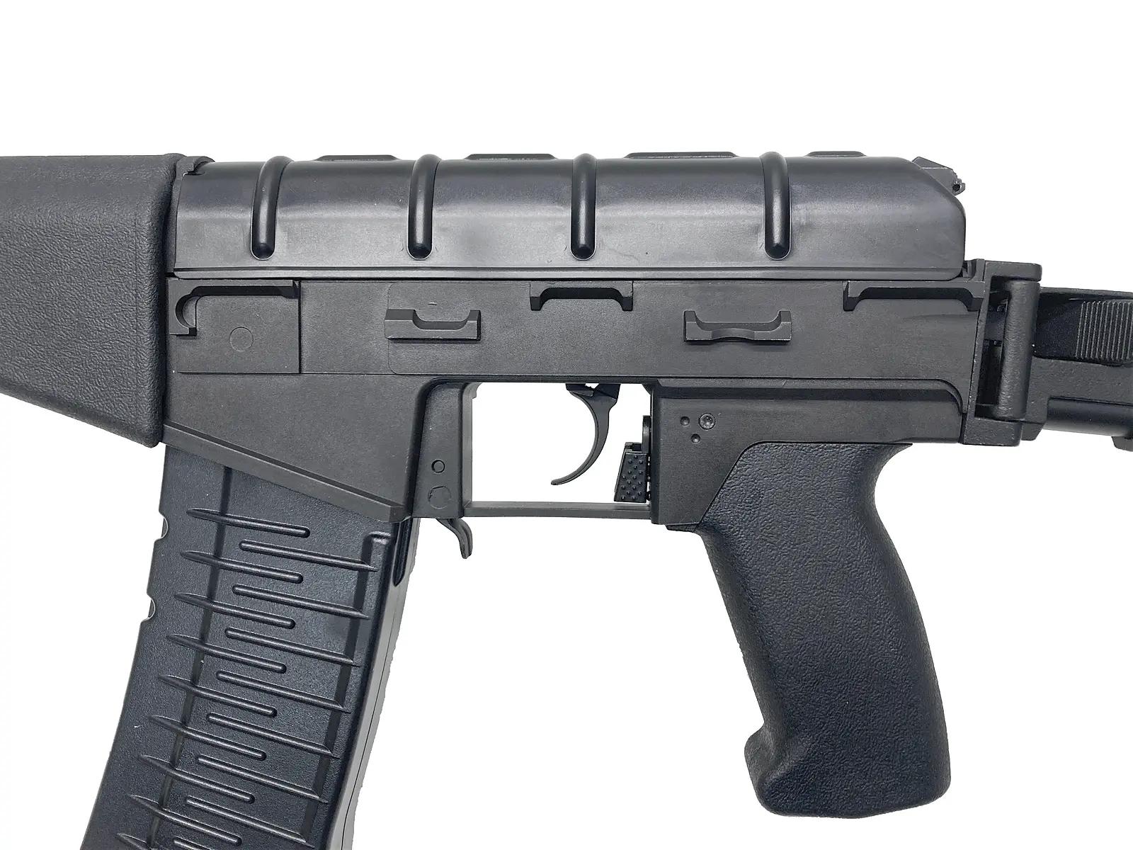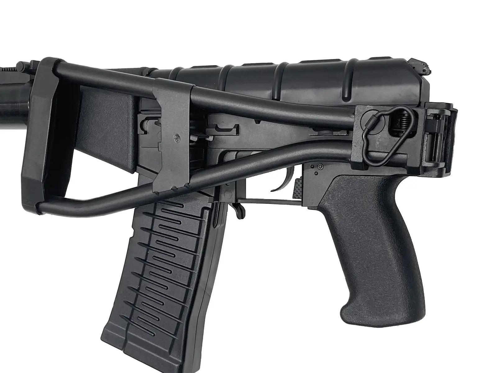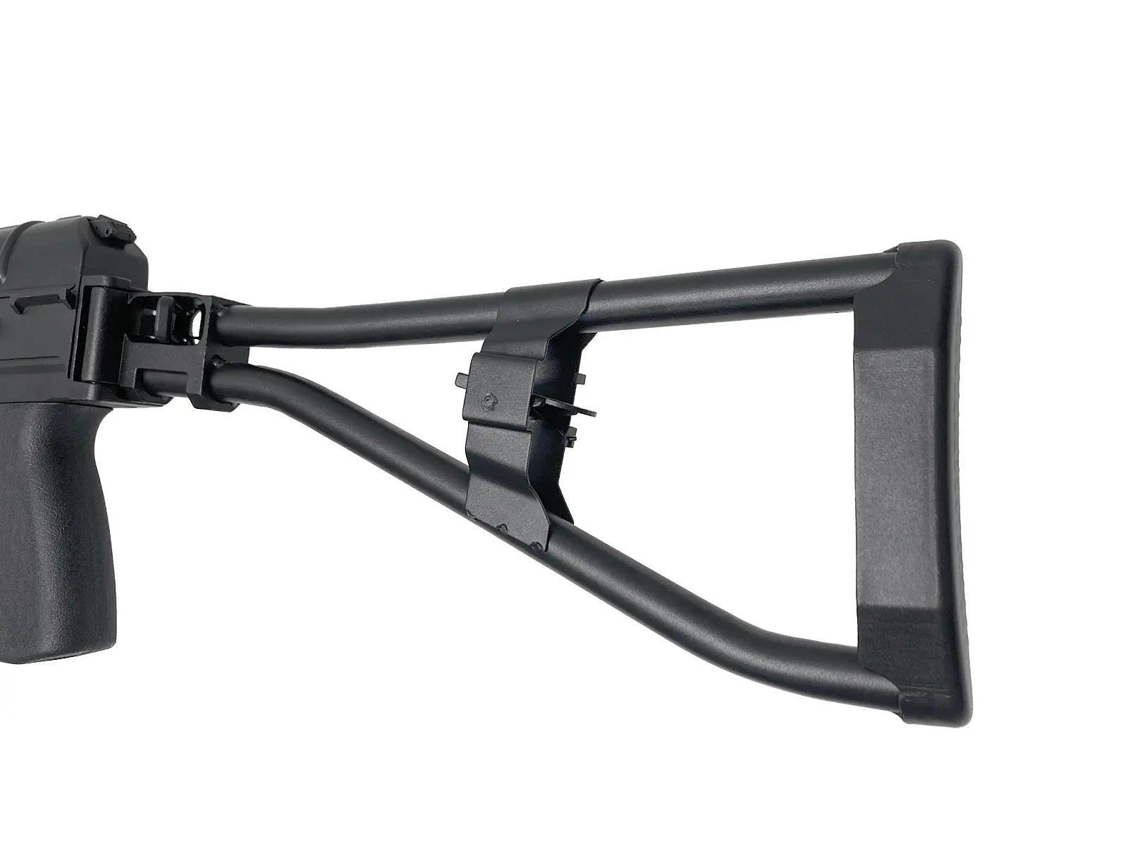 フォールディングストックはスチール製で十分な強度を確保しており、実銃の魅力を見事に再現した電動ガン。