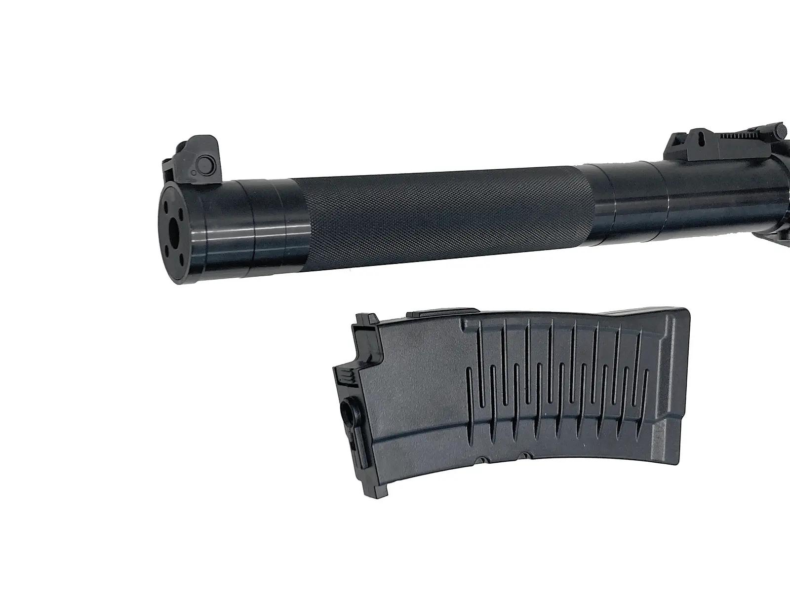 本製品AS VALは、バレルジャケットを兼ねた長大なサイレンサーが特徴的な独特のフォルムを忠実にトレース。