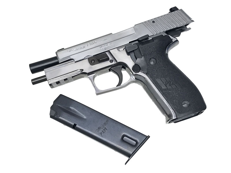 スイスのSIG社のP220シリーズの一つがこのP226。1983年に生まれた複列弾層の9mmオートで(1998年には40S&W、357SIGも)、デコッキング機構あり。優秀な銃であり、命中精度や信頼性の高さでは定評がある。価格は高く、グロック17やベレッタM92FS等と比べると100ドル以上高く、それもあってか米軍制式拳銃のトライアルでは負けたことも。また、トリガーが遠く、トリガープルが長い。銃身線が高いという欠点もある。しかしそれを補って余りある性能のために米空軍では制式採用された。この他、SWAT、FBI、各国軍隊、特殊部隊で使われている。プロが用いる拳銃である。2000年にはUS Navy Sealsの要請を受け、ステンレス削り出しのスライド(表面処理は黒もあり)つきが標準となった。このように細かな仕様変更が行われ、信頼性はさらに向上している。  フィクションの世界では『SPRIGGAN』(たかしげ宙&皆川亮二、小学館)の御神苗優、「X-File」セカンドシーズンのモルダー捜査官が使用している。