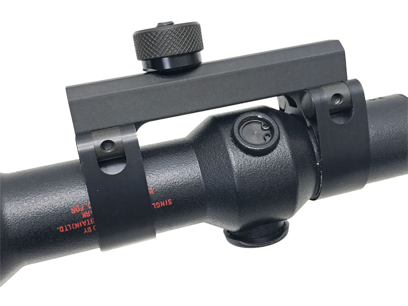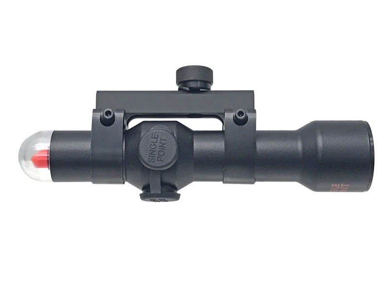 dnA Single Point Red Dot ビンテージ感を重視したレプリカドットサイト。スチール製メインチューブとリアル光ファイバーを採用し、バッテリー不要で運用できる点が特徴。レンズ越しに像は見えず、赤い光点のみが投影されるため、片目で光点を捉えつつもう片方でターゲットを見る立体視照準を行う。ゼロイン調整に対応し、ラバーカバー付きの調整ナットも装備。付属のキャリングハンドルマウントはM16/M4系に対応し、クラシックな外観との相性も良い。