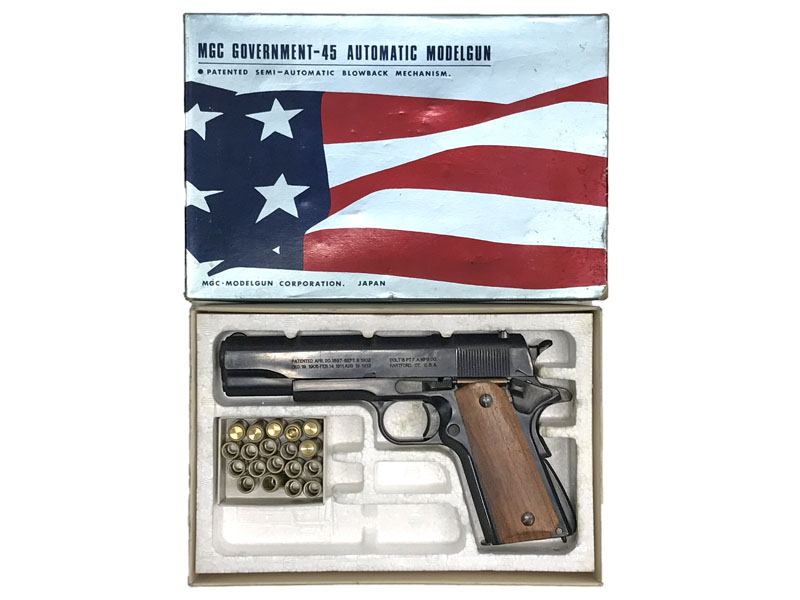 1974年に登場したGM2は、MGC初のプラ製ガバメントモデル。法改正により金属製が規制される中、黒い外観と貫通銃腔(インサートあり)を実現し話題を集めた。ミリタリーとコマーシャルの2種を展開し、後にコンバット仕様や高級カスタムも登場。発火方式やカートも進化し、15年にわたって生産された名作である。