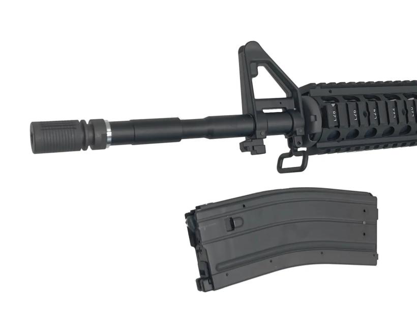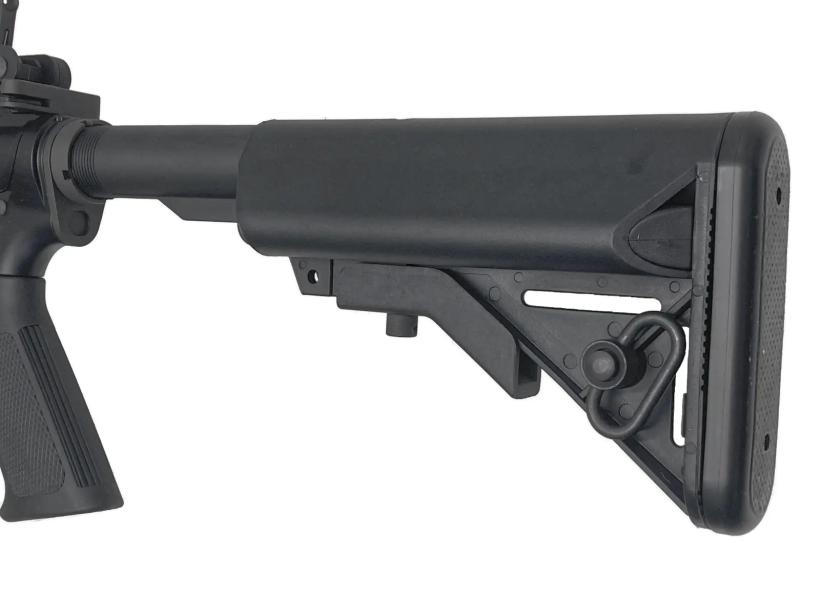 ナンバリングが再現され、アルミ製ヒートシールドが内蔵されたアルミ製ハンドガードを はじめ、BUISフリップアップ・リアサイト、QDスリングベルが付属したクレーンタイプ ストック、ナイツタイプのフラッシュハイダーといったハイグレードなデラックス仕様の パーツを多数搭載。米国特殊作戦軍SOCOMで使用されるSOPMODモデルを完全再現! 一般的な14.5インチアウターバレルを装備した、カービン・タイプ!