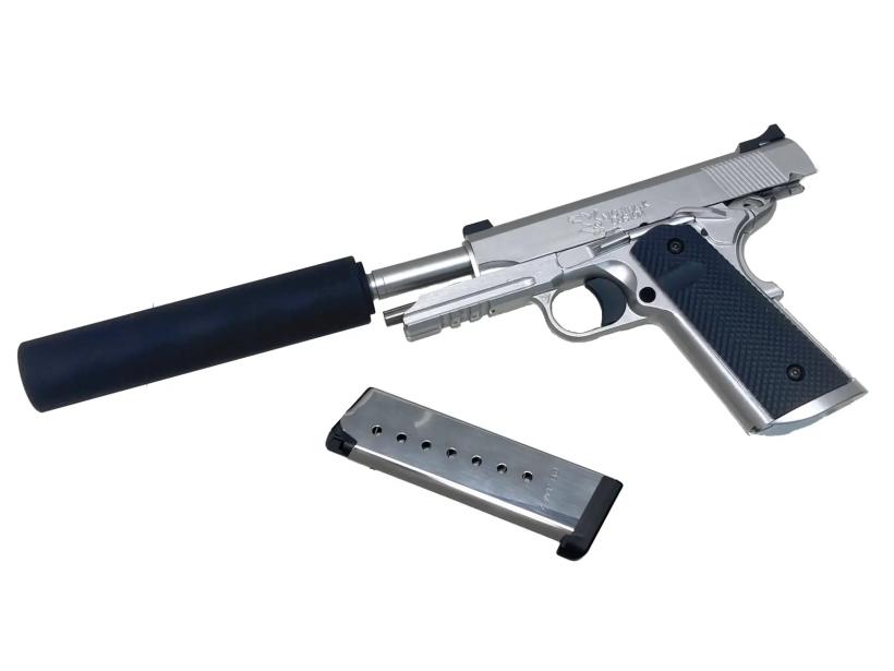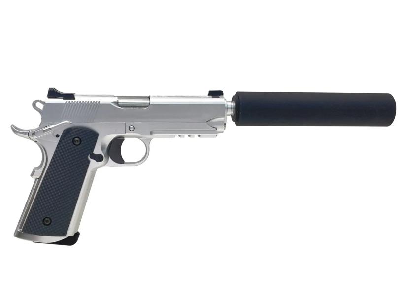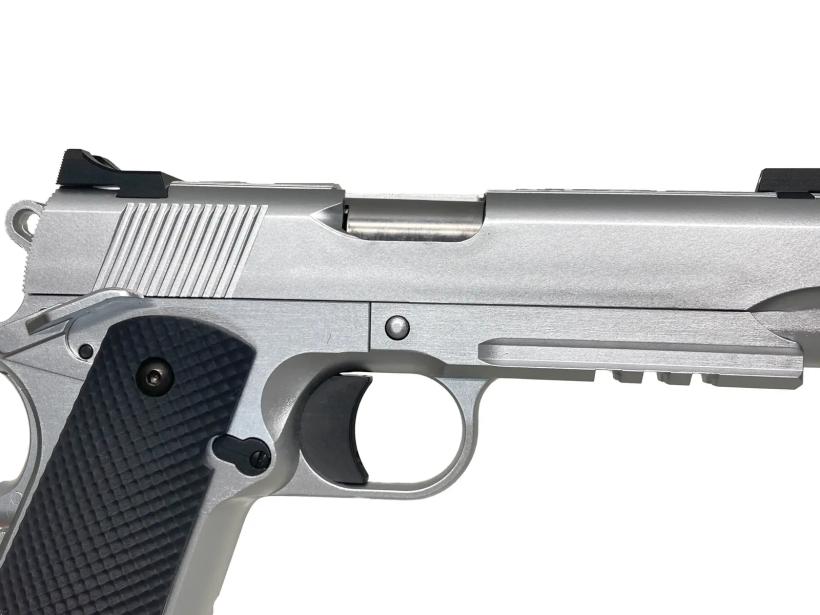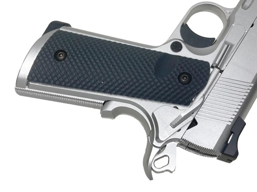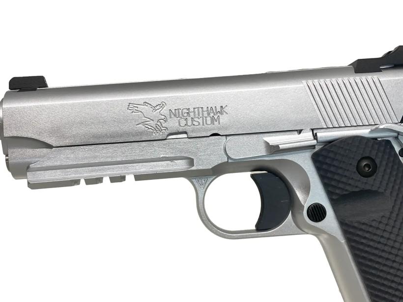 作中同様、ナイトホークカスタムの刻印が施された4インチ相当のコマンダーレングスのスライドやスレッデッドバレル、レールドフレームを忠実に再現。さらにソリッドタイプのロングトリガーやヘイニースラントプロリアサイト、ゴルフボールパターンのグリップなどが装着されている。