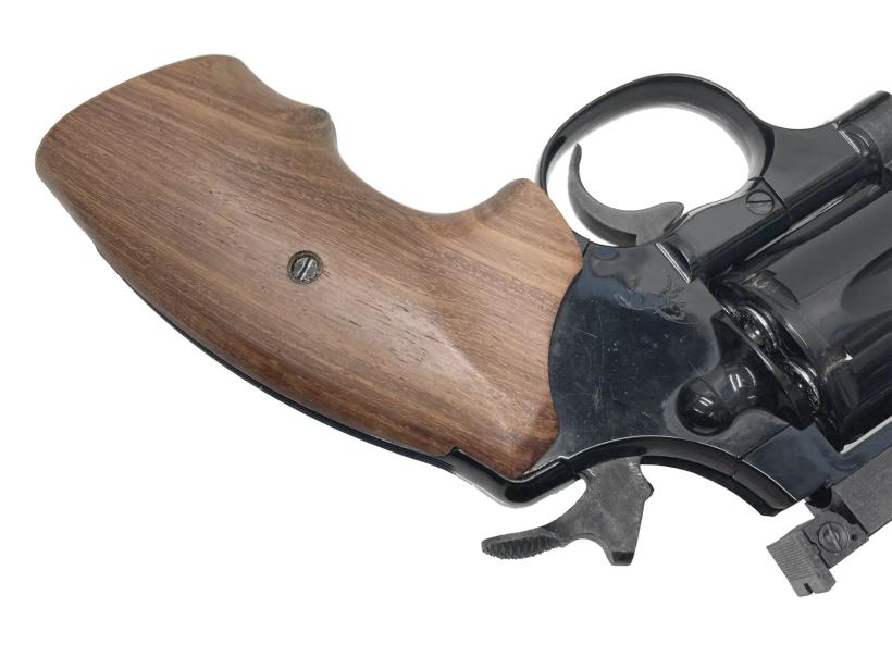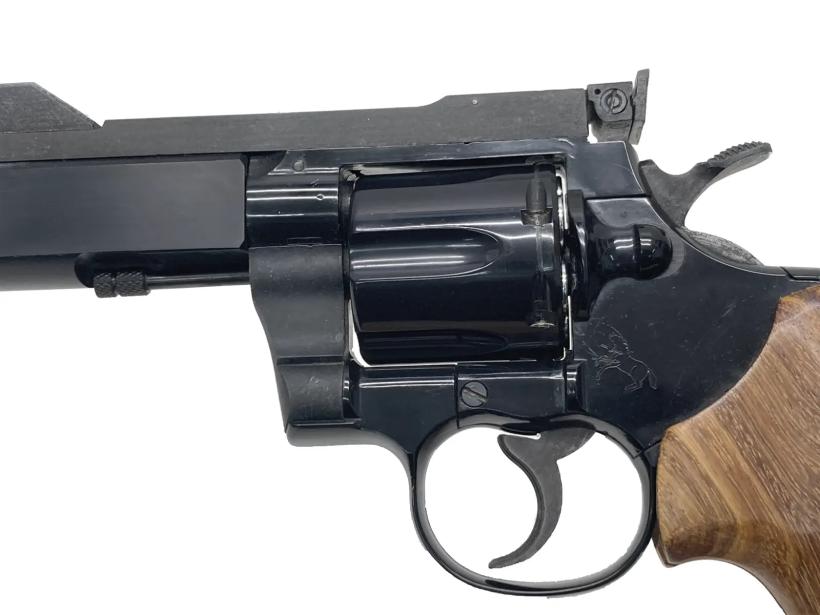オリジナルのパイソンをベースとして、バレルをスラブバレルに換装。ジュラコンというエンジニアリングプラスチックを使用しCNCでの機械切削で丁寧に削り出して制作されている。特徴的なリブサイトは金属製でボーマータイプのリブサイトをモデルアップし、リアサイトの調節ももちろん可能だ。専用の木製グリップも紫檀を使用して丁寧に制作されており、ロットによって3種類ほど形状が違うようだ。