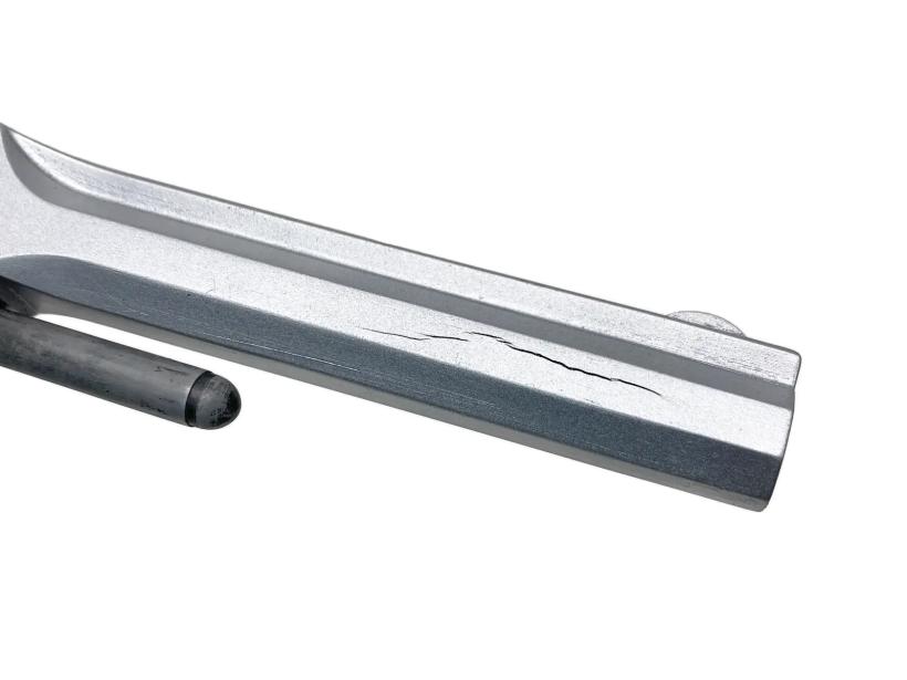 [マルシン] 坂本龍馬の銃 S&W Model2 Army 木製グリップ ダミーカートリッジ仕様モデルガン 組み立てキット完成品 バレルヒビ/シルバー塗装 (訳あり) 製品詳細画像6 バレルヒビがあります
