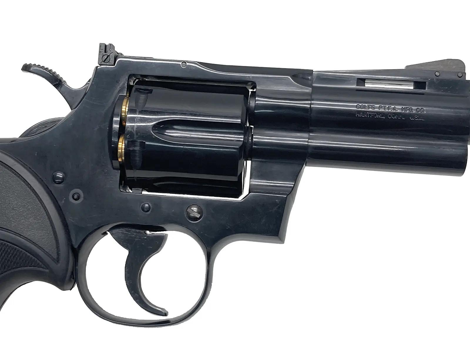 リボルバーの代名詞たるパイソンの、実用性に長けた3インチモデルをコクサイが具現化した。素材には定評あるGR2000を採用し、ABSモデルながら丹念な研磨による深みのある光沢が目を引く。コルト社のロゴを配したラバーグリップは手に馴染み、取り回しの良さを際立たせている。発火モデルとしての信頼性と、鑑賞に堪えうる美しさを高次元で結実させた、リボルバーファン垂涎の完成度と評したい。
