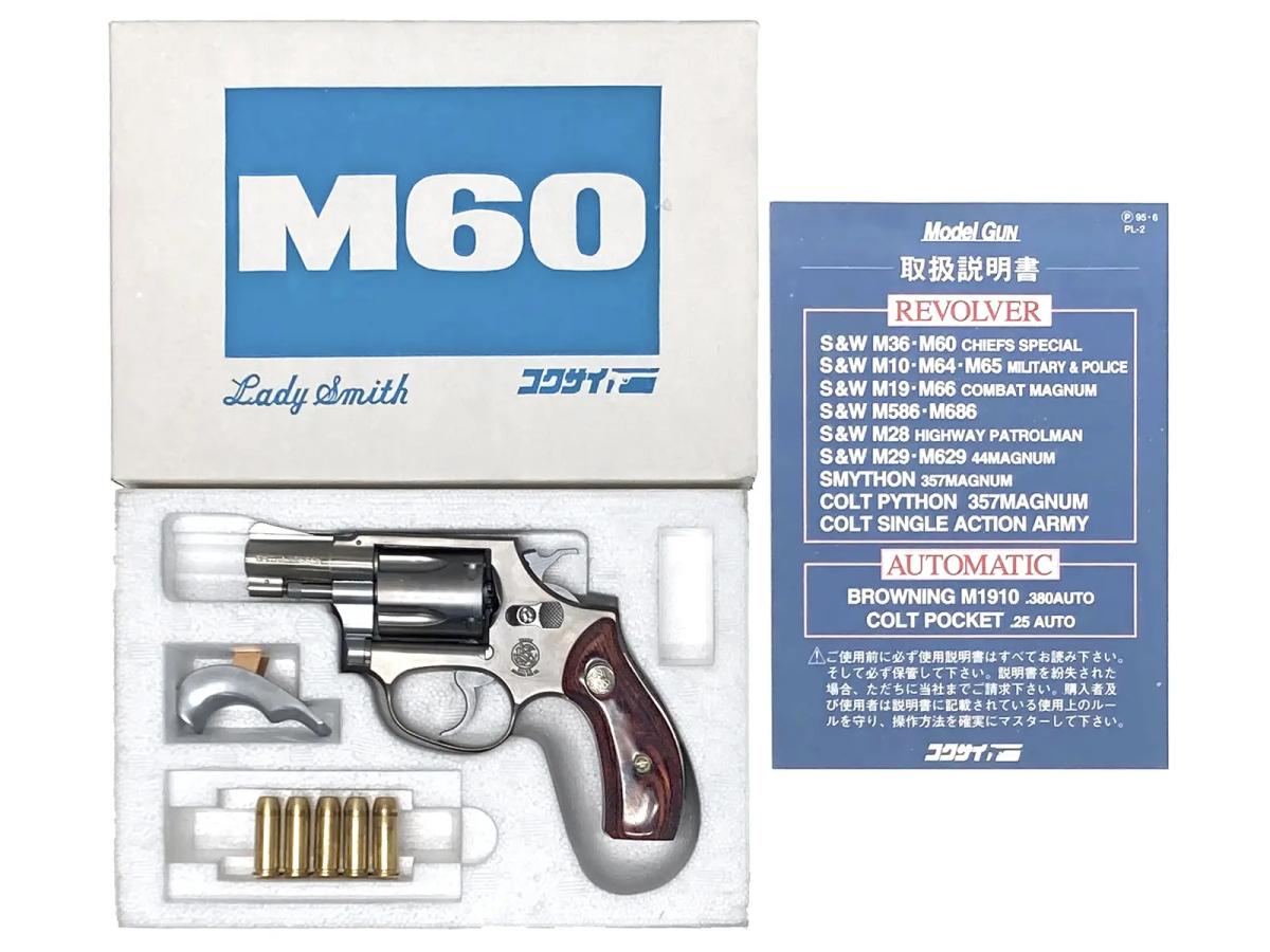 コクサイNO.169。実銃のM36は、装弾数が5発と通常のリボルバーの6発より1発少ないが、これによって小型軽量化が図られたチーフスペシャル。M36のステンレスモデルがこのM60。フレームには「Lady Smith」のマーク入り。標準でカートリッジ5発付属。