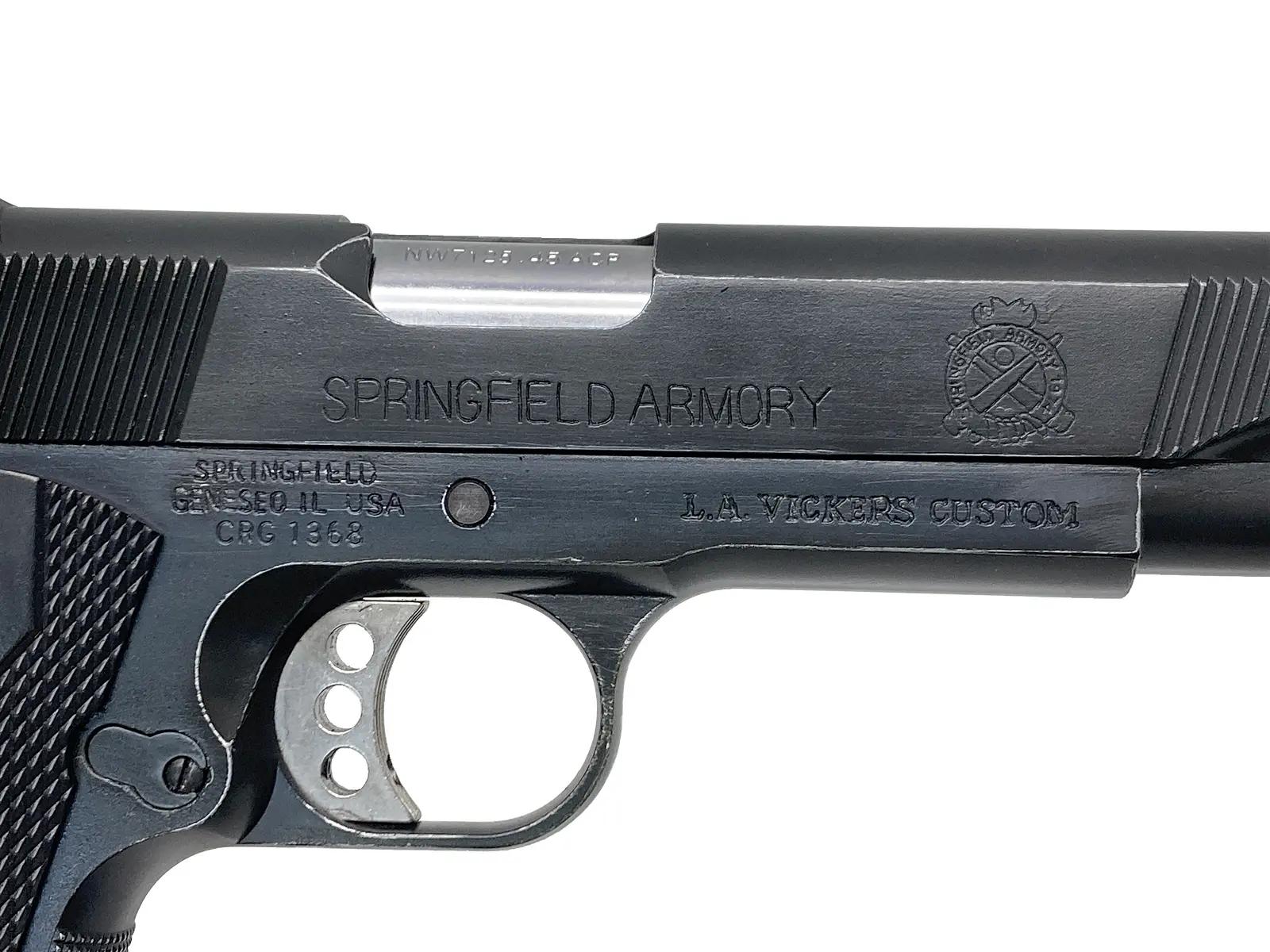 「VICKERS CUSTOM」などの追加の刻印に加え、スチールロングリコイルスプリングガイドやSFAメダリオン入りグリップに換装したカスタム品。木箱付き。