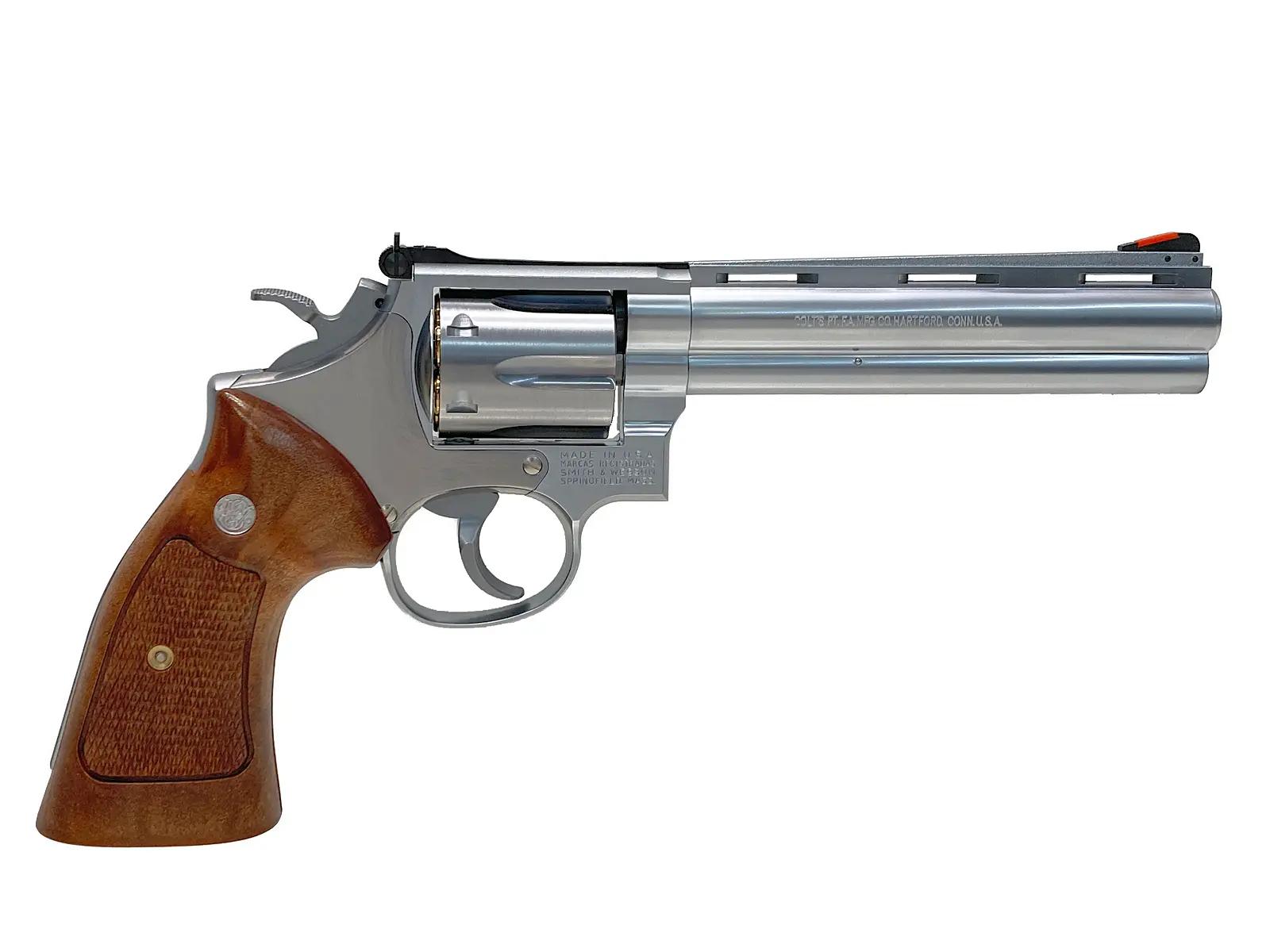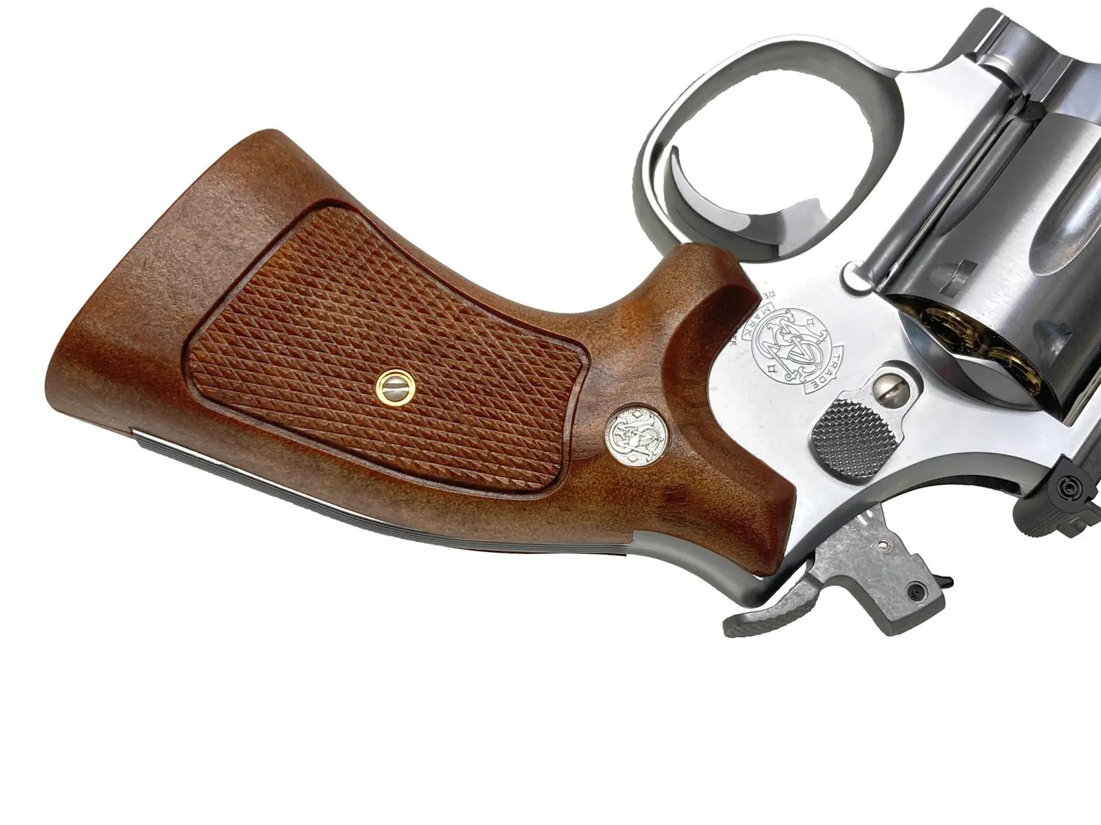 細部のこだわり: パイソンバレルの刻印や、S&W M19由来のフレーム形状、木目調のグリップなど、細部まで徹底的に作り込まれています。