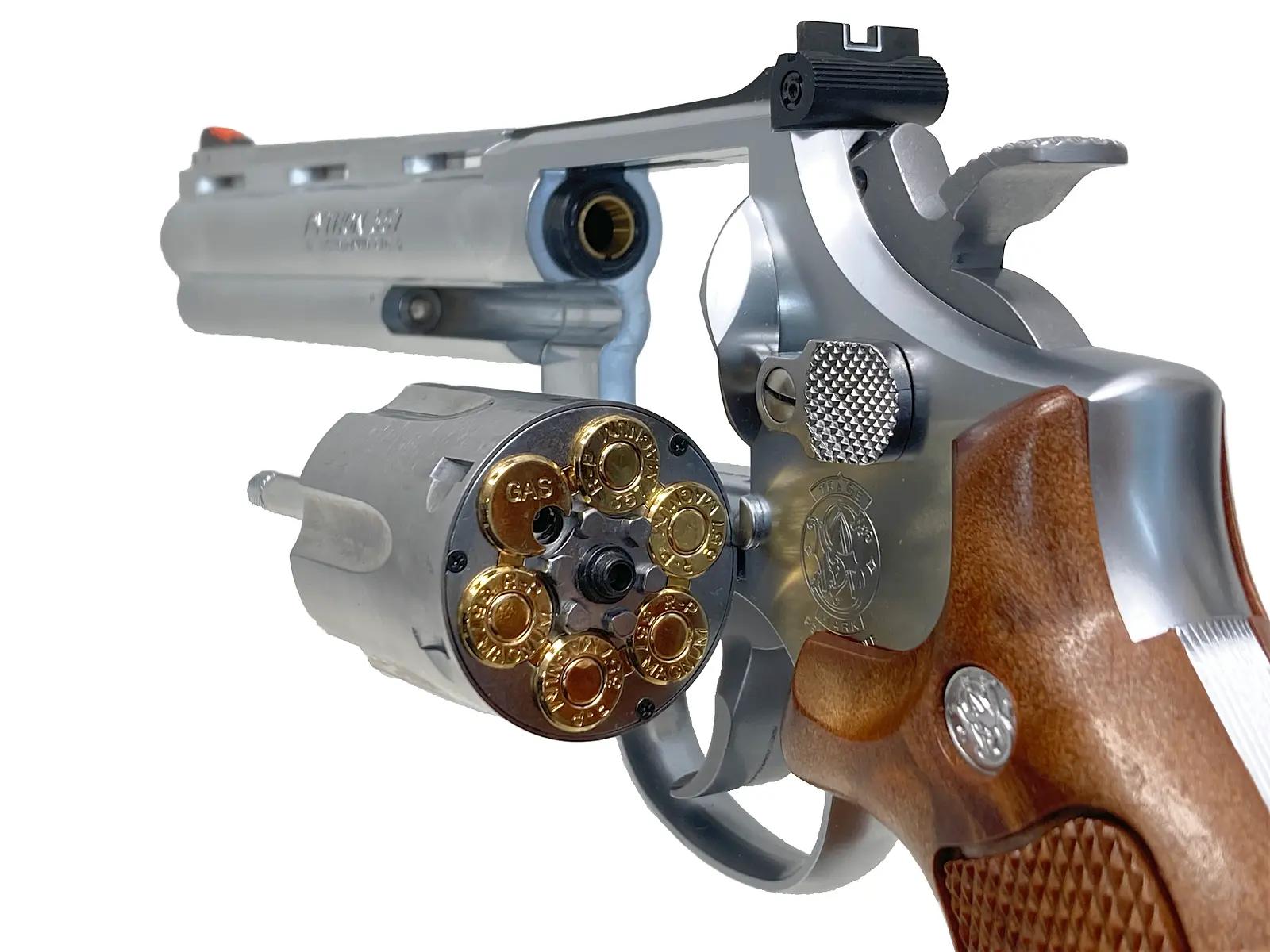ステンレスフィニッシュ: 硬質な輝きを放つシルバー塗装を施し、実銃のような重厚感ある質感を再現。