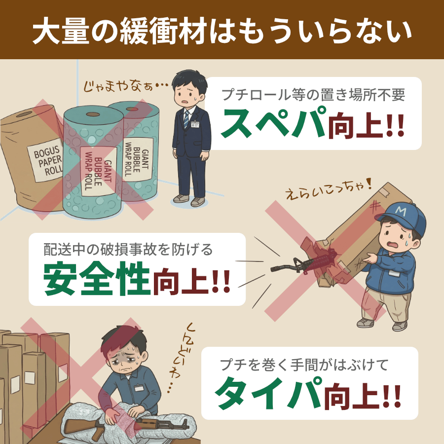 エアガン(長物)を発送する際、箱の中で動いて破損するのが一番の不安ではありませんか?このキットは、専用の中敷きに付属のインシュロック(結束バンド)で本体を直接固定できる革新的な構造です