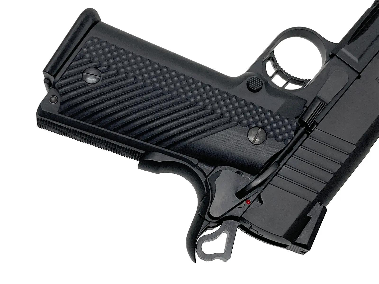 1911の戦術的進化を象徴するパラオード・ワイドボディを、ウエスタンアームズが至高のスペックで再現した。カーボンブラックHW樹脂に施された黒染め仕上げが、プロフェッショナルな重厚感を演出。定評あるS.C.W.ハイスペックver.3を搭載し、大容量タンクから放たれるブローバックはシリーズ屈指の衝撃を誇る。実用的なG10グリップや消音器を備え、機能と迫力を高次元で融合させた現代タクティカルの決定版と言える。