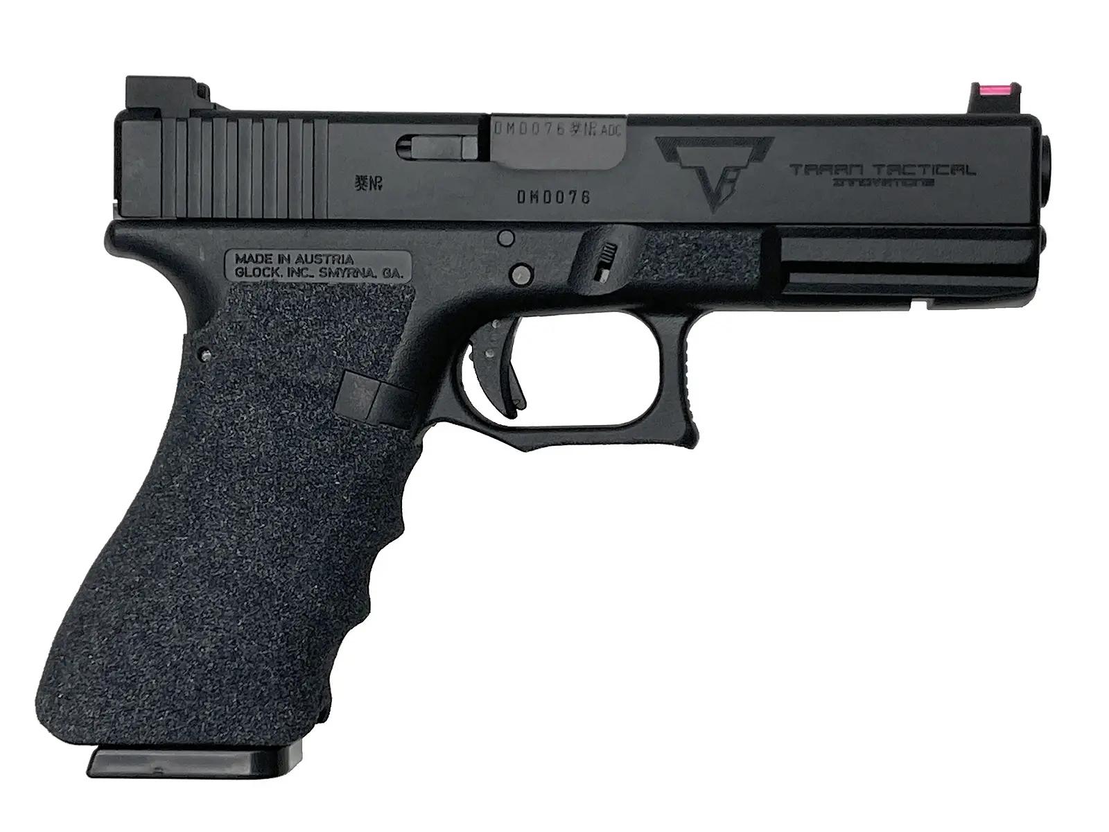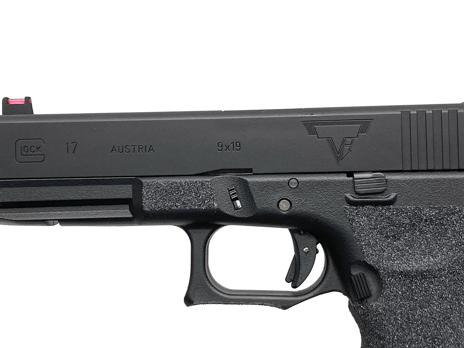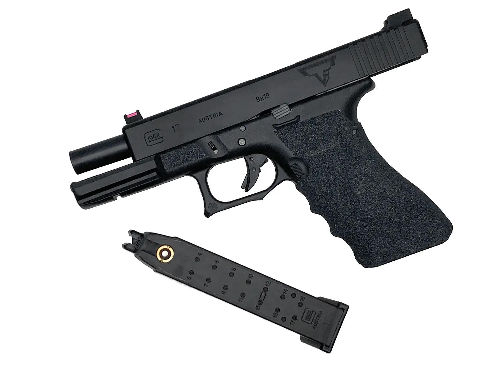 東京マルイ製G17をベースに、TTIスタイルの機能美を追求したコンプリートカスタムだ。GUARDER製フレームには3Mシリコンカーバイトの滑り止めとハイグリップ加工が施され、掌に吸い付くようなホールド感を実現している。作動の安定性を重視して純正スライドを採用しつつ、ファイバーサイトや精緻な刻印で実戦的な質感を底上げ。タクティカルな操作性と造形美が絶妙に融合した、極めて信頼性の高い一挺といえる。