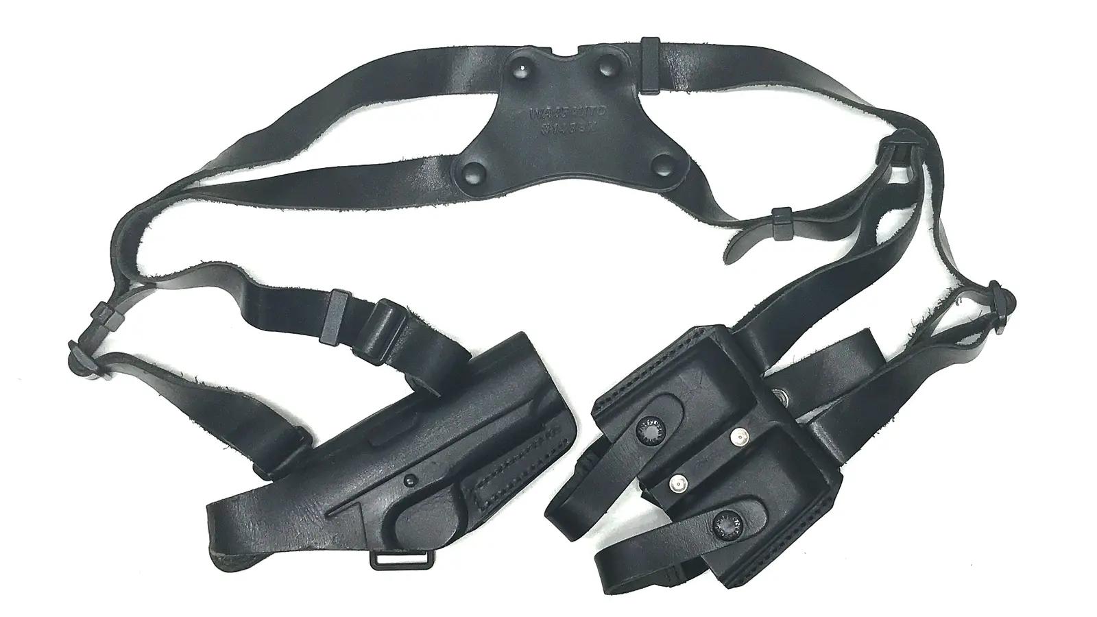 「ダイハード」などのポリスムービーにも登場する銃を左脇に水平に吊るす彫りぞなるタイプのサムブレイクホルスターと、右側にダブルマガジンポウチが付いたフルセット。銃を正面に引き抜くことができるので、クイックドロウに適しています。