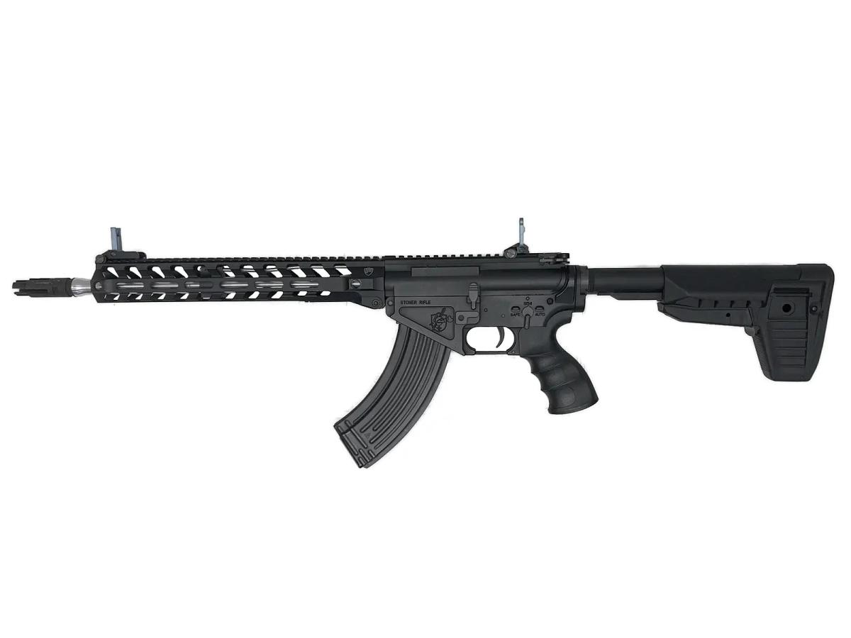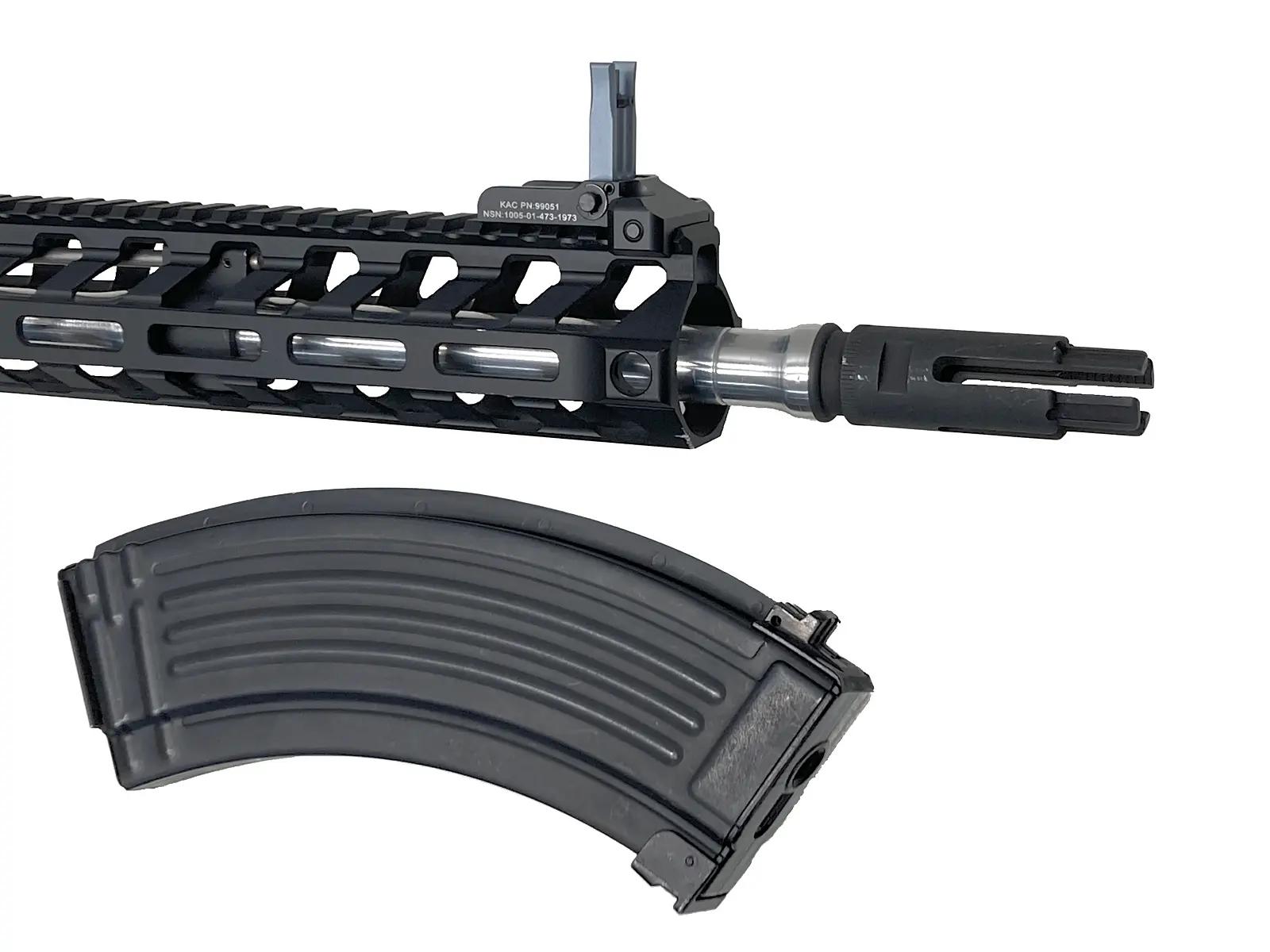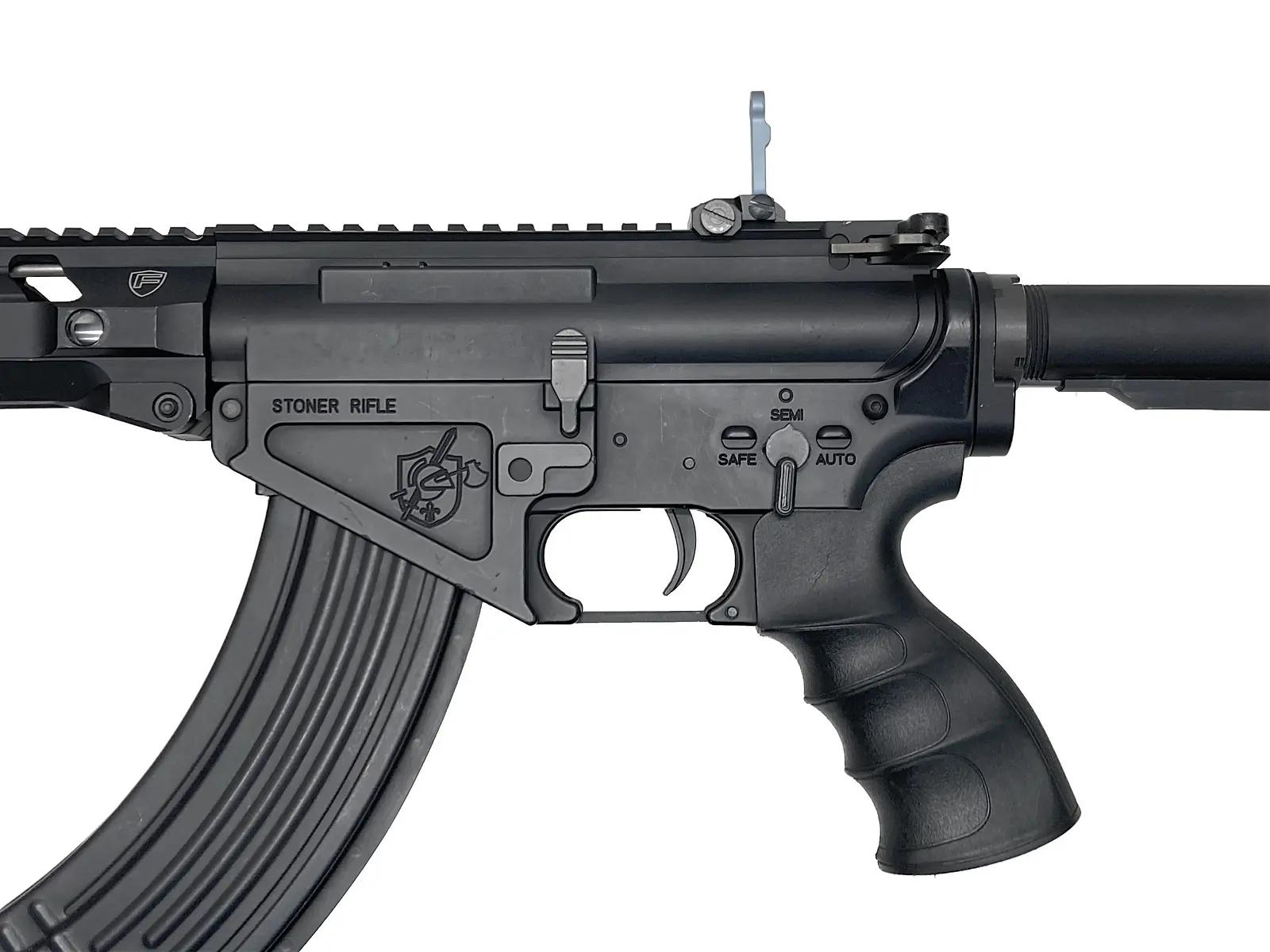 ナイツアーマメント社の設計思想とAKの合理性が融合した、特殊運用モデルの決定版。本作は公式ライセンスを取得しており、レシーバーに刻まれた刻印がその希少性を物語る。独自のBRSSシステムにより、撃つたびに肩へ響く鋭いリコイルを実現。M4の操作系を維持しつつAKマガジンを運用する独創的なスタイルは、実用性と浪漫を高い次元で両立させている。